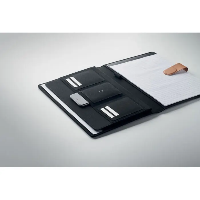 Designed for convenience during meetings and conferences, this portfolio includes a replaceable A4 notepad with 30 lined pages made from recycled paper. Stay organized with a dedicated pen holder, four cardholders for business cards, three small pockets for essentials, and one large compartment for documents. The magnetic strap closure ensures everything stays secure.