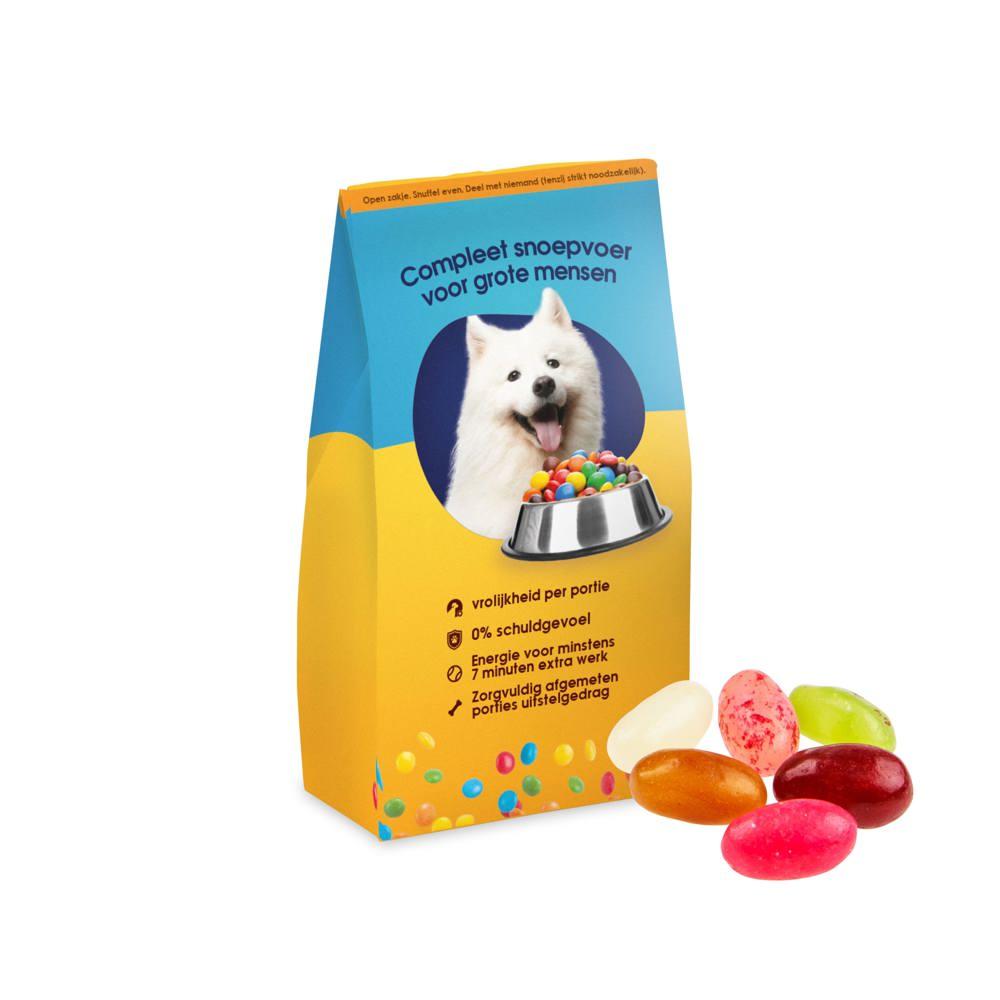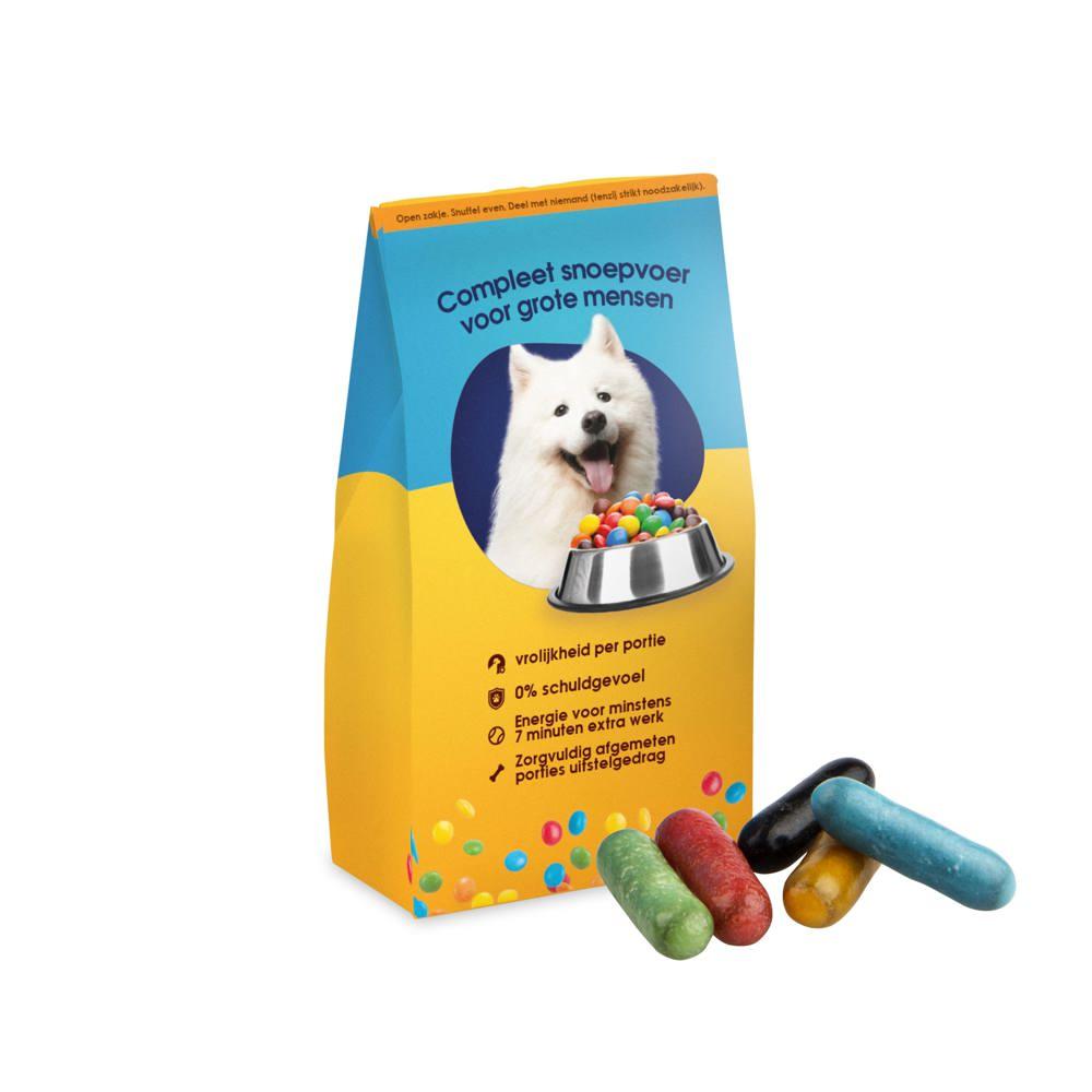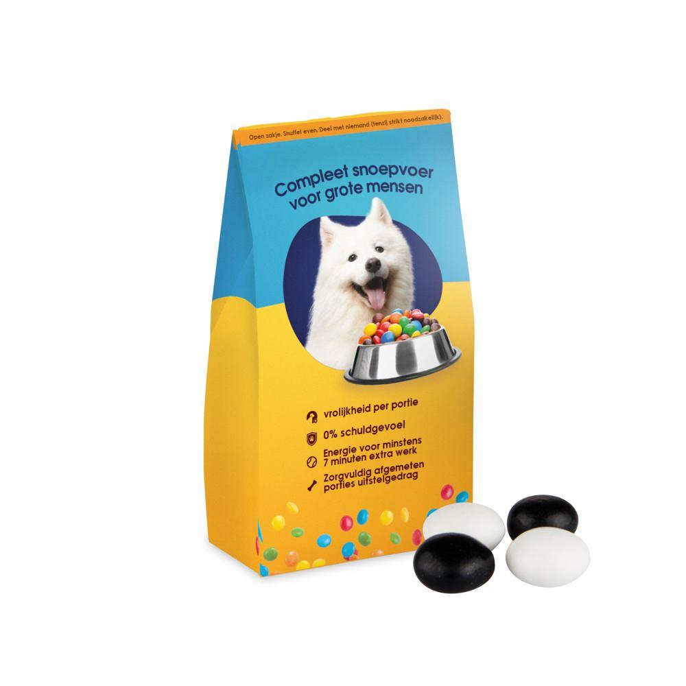 Elevate your promotional giveaways with our customizable Feeding Bag, featuring all-over full-color printing for vibrant logo display and brand messaging. Filled with approximately 30 grams of assorted licorice sticks mix, it delivers a delightful, shareable treat that captivates event attendees and clients alike.