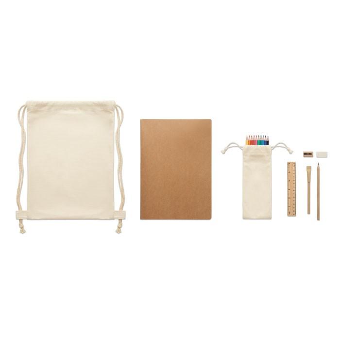 Elevate your brand visibility at events with this comprehensive kids drawing set, perfect for marketing professionals and event organizers. Ideal as personalised promotional giveaways, it features a 5-piece stationery set including wooden ruler, wooden sharpener, eraser, wooden pencil, and cardboard ball pen. Plus, 10 colouring pencils and 50 sheets of A4 recycled paper (100 pages total), all neatly packed in a reusable cotton drawstring bag.