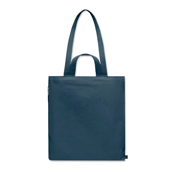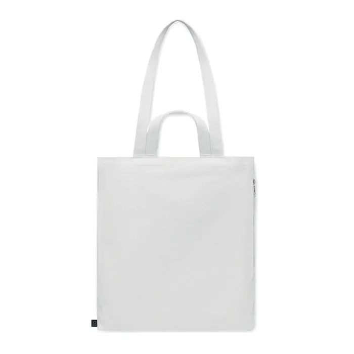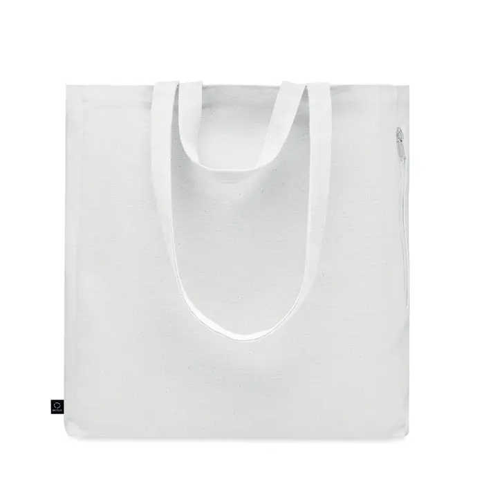 Elevate your brand's eco-conscious image with our Recycled Polycotton Shopping Bag, crafted from 70% recycled cotton and 30% recycled polyester for superior durability at 380 gr/m². This versatile tote features short and long handles for easy carrying, plus a convenient side zippered pocket for essentials—perfect for shopping, beach outings, or promotional events.