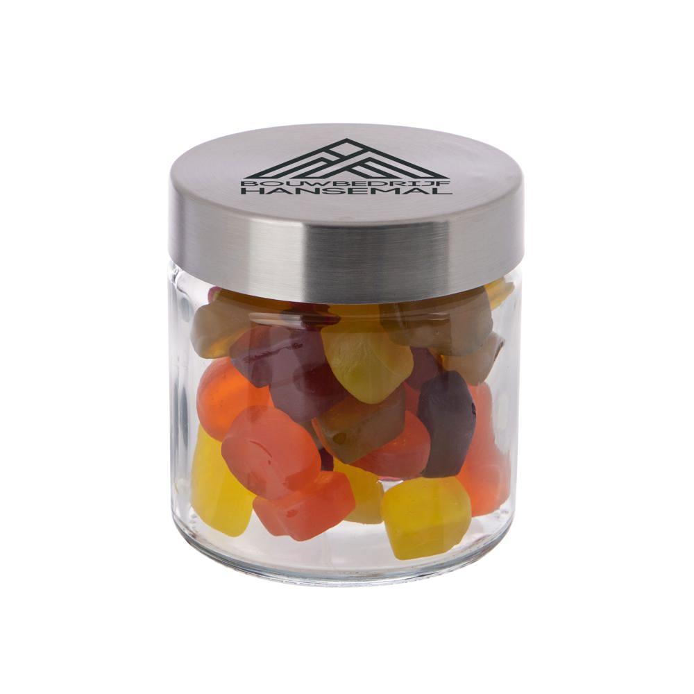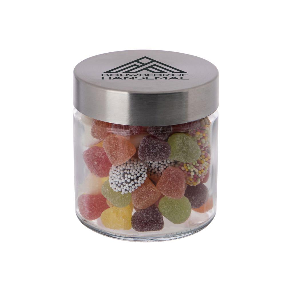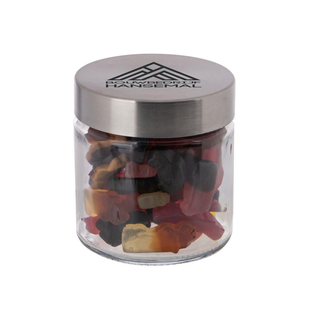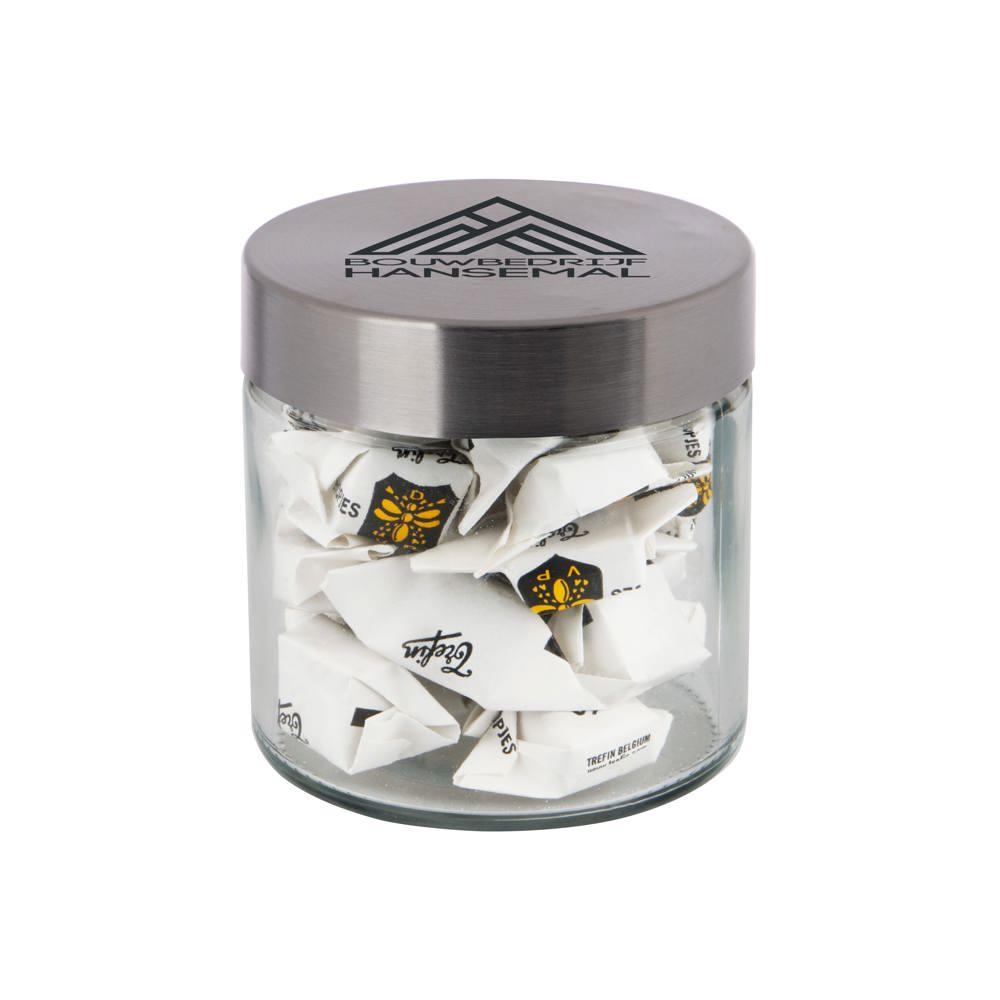 Elevate your promotional giveaways with this elegant 0.35-liter glass jar featuring a durable stainless steel lid. Pre-filled with premium sweets, it's the perfect customizable gift for events, trade shows, or client appreciation.