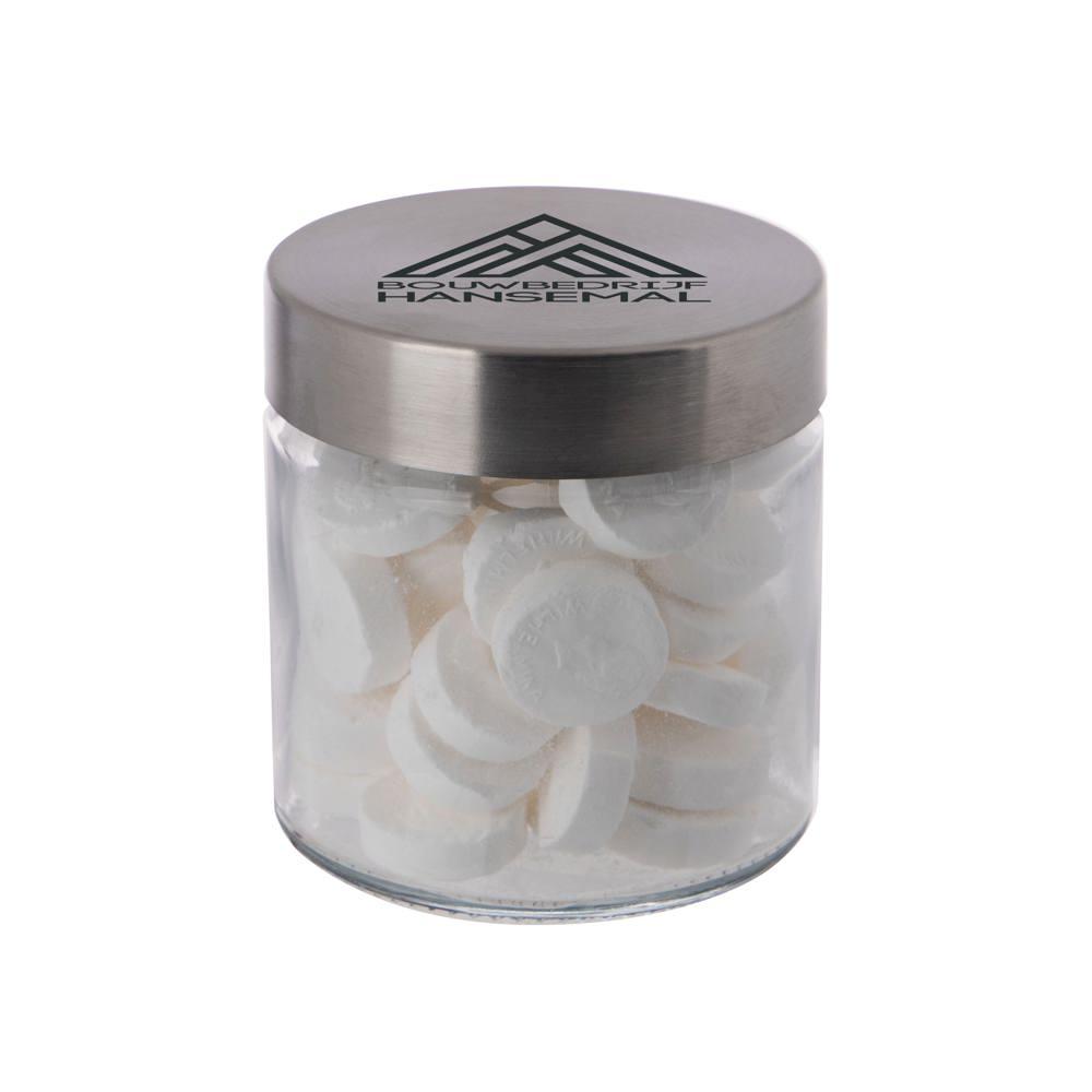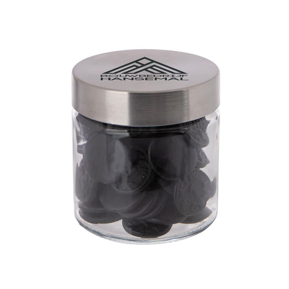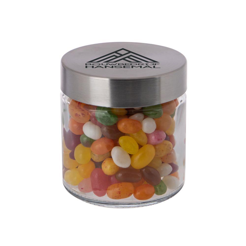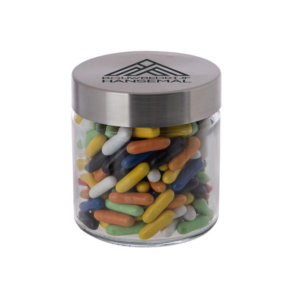 Elevate your promotional giveaways with our customizable 0.35L glass jar, complete with a durable stainless steel lid and filled with premium metallic sweets. Ideal for marketing professionals and event organizers, this 83mm diameter jar provides a sophisticated, reusable vessel perfect for logo imprinting to maximize brand visibility.