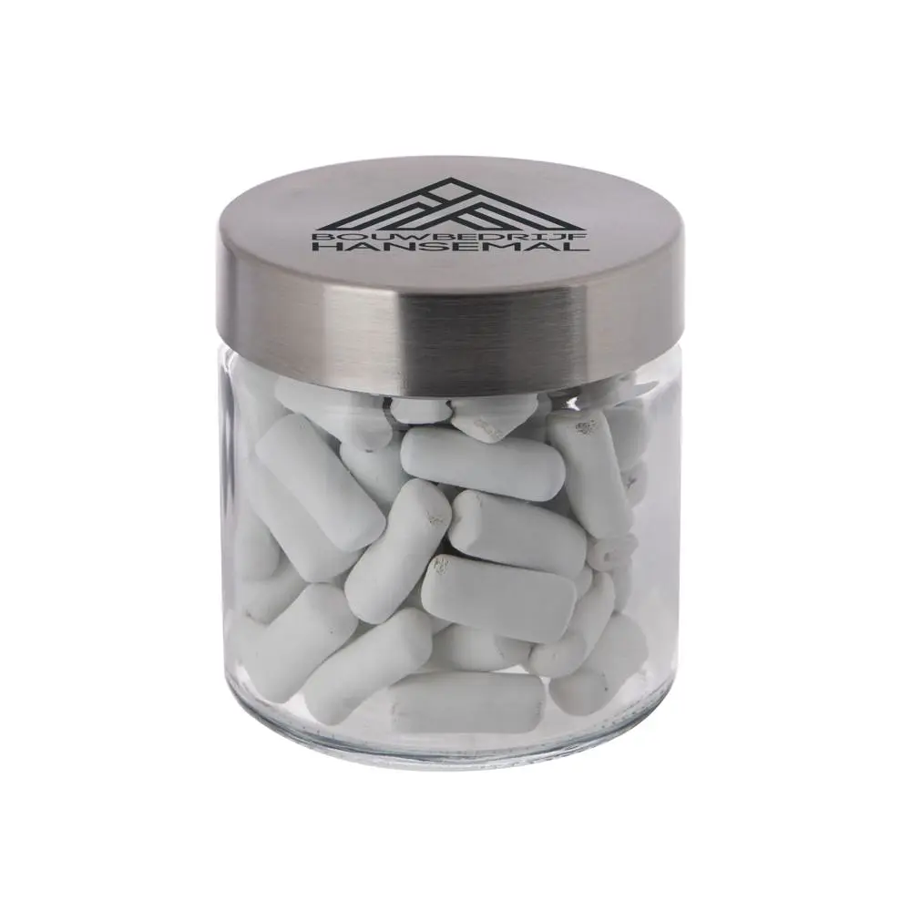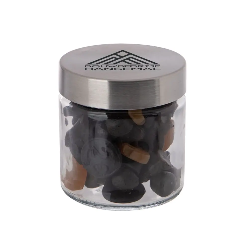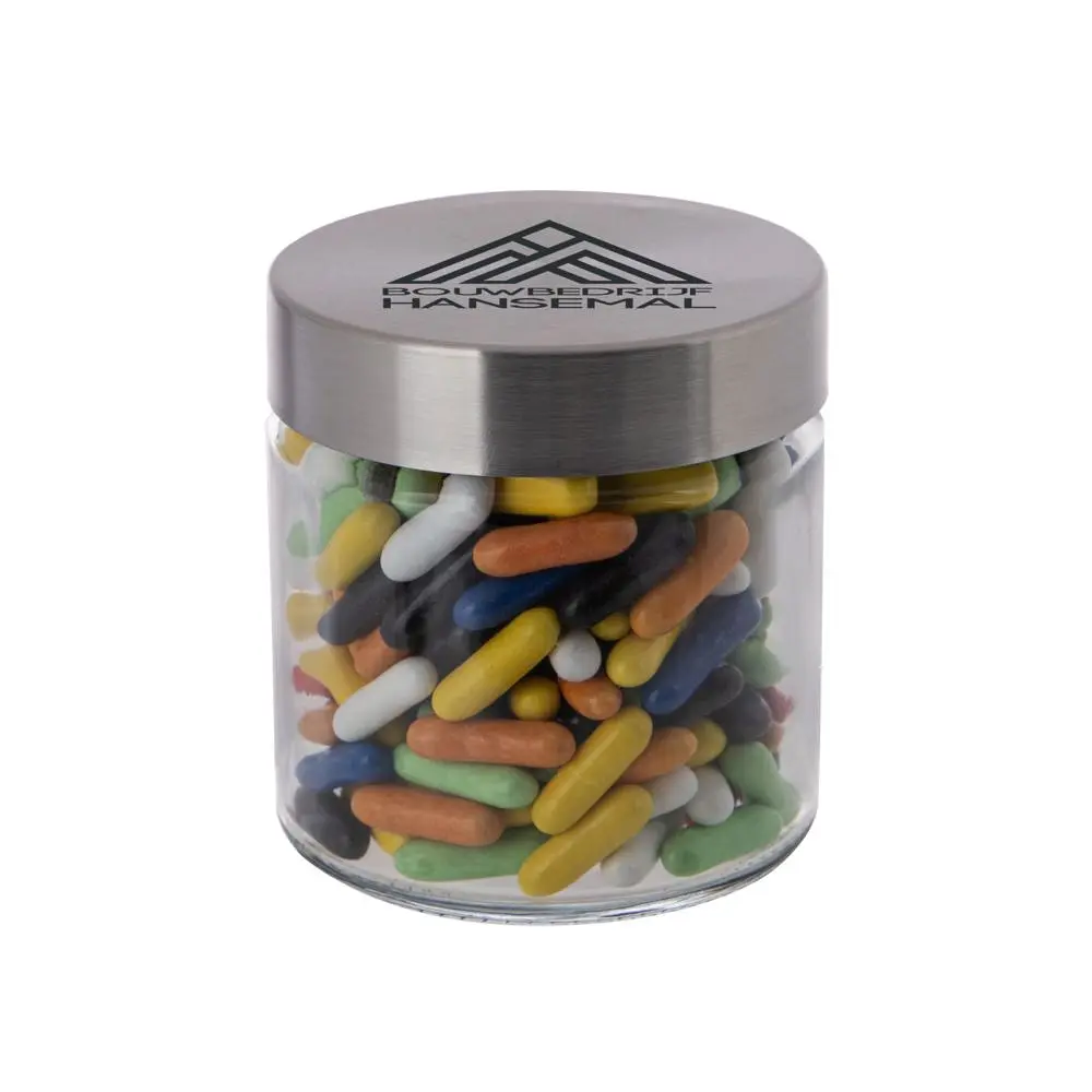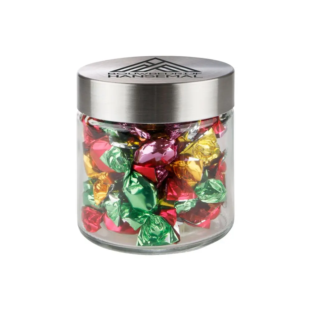 Elevate your branding with this elegant 0.35-liter glass jar featuring a durable stainless steel lid. Pre-filled with metallic sweets, it's an ideal giveaway for events, trade shows, or client appreciation gifts. The clear glass showcases your logo prominently when customized, ensuring your brand stays visible long after the event.