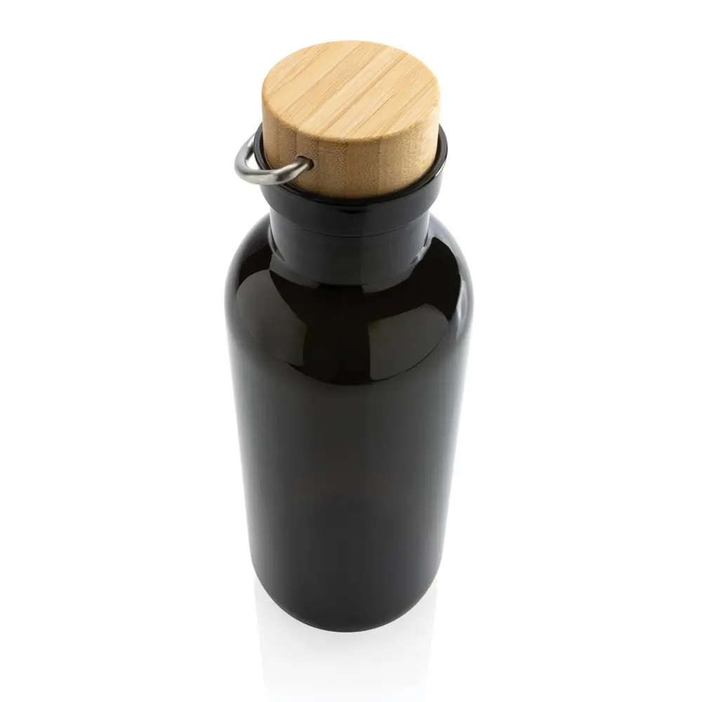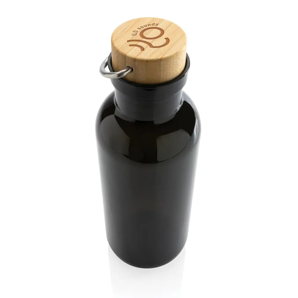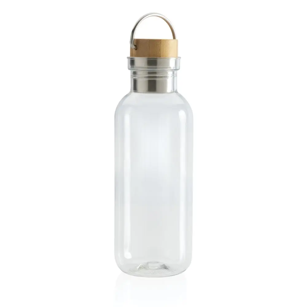 Elevate your brand's eco-conscious image with our customizable RPET water bottle, featuring a stylish FSC-certified bamboo lid and convenient handle for effortless portability. Crafted from 100% RCS-certified recycled PET with 56% total recycled content, it promotes sustainability while meeting rigorous compliance standards like Global Recycled Standard and BPA-free materials. Ideal for marketing campaigns and events, this 680ml single-wall bottle holds cold drinks only and comes in FSC-certified kraft packaging—perfect for bulk personalization to impress clients and reinforce your green commitment. Hand wash recommended. Diameter: 75mm.