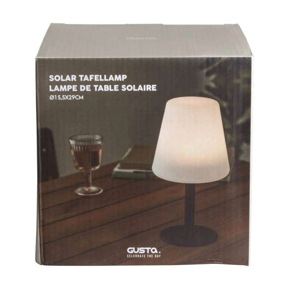 Elevate your branding with the Gusta solar table lamp's elegant metal base and durable plastic lampshade. Its minimalist style makes it a standout promotional item that reflects your company's sophisticated image.