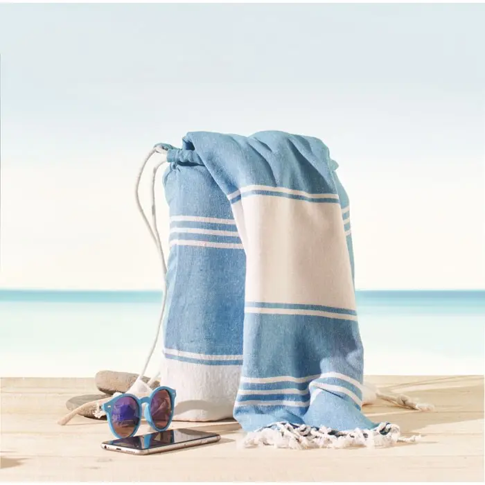 Elevate your brand with this eco-friendly hammam towel and drawstring bag set, perfect for promotional giveaways at events or client appreciation gifts.