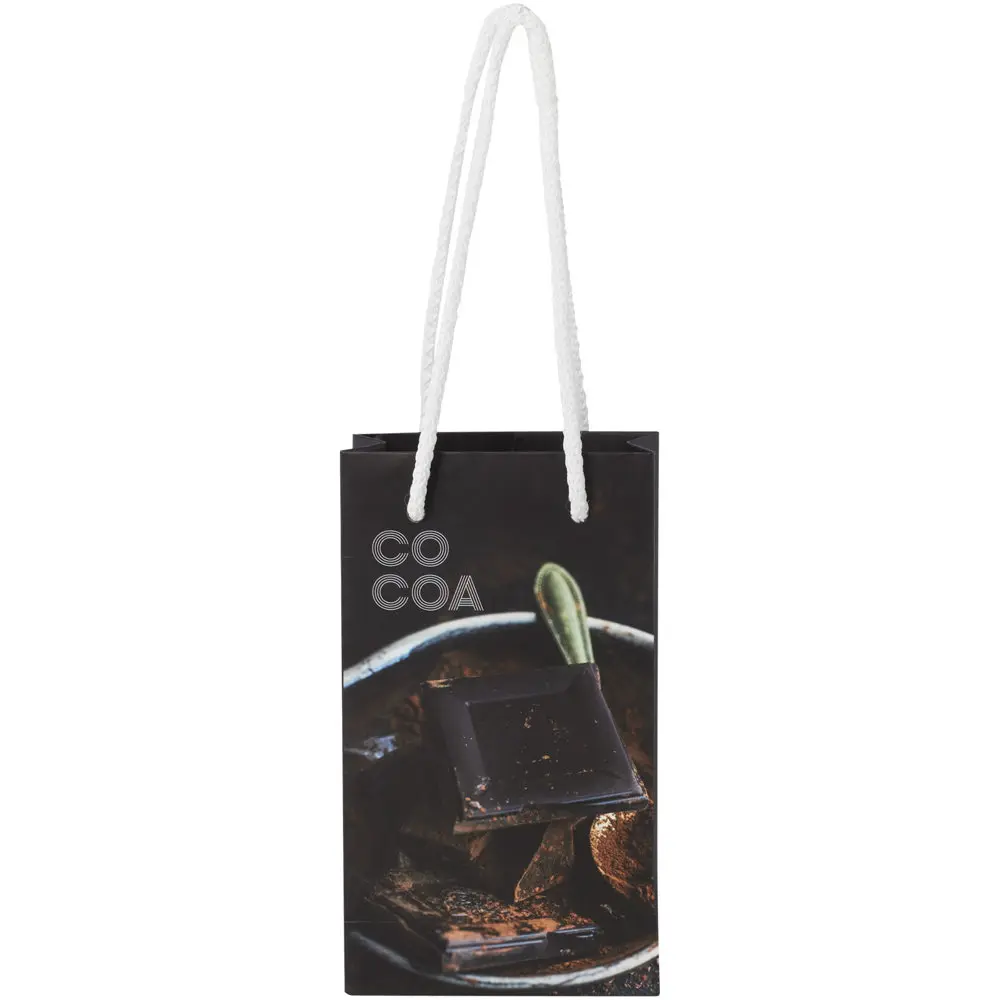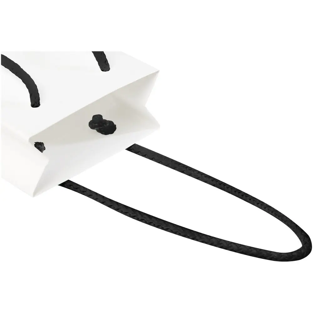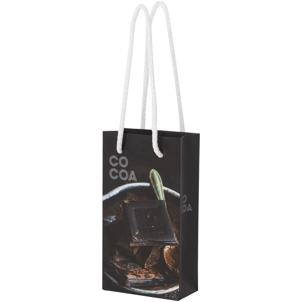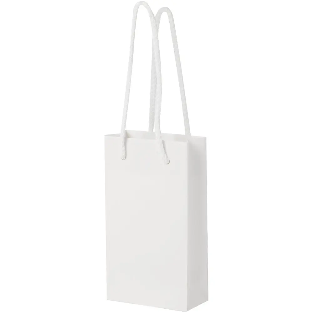 Elevate your brand visibility with our handmade 170 g/m² Integra paper bags, featuring cord handles and a compact size of 9.5 x 4 x 17 cm. Crafted from premium laminated paper, these durable bags offer ample space on the front and back for custom logo printing or designs, turning them into powerful promotional tools for events, trade shows, or client giveaways.