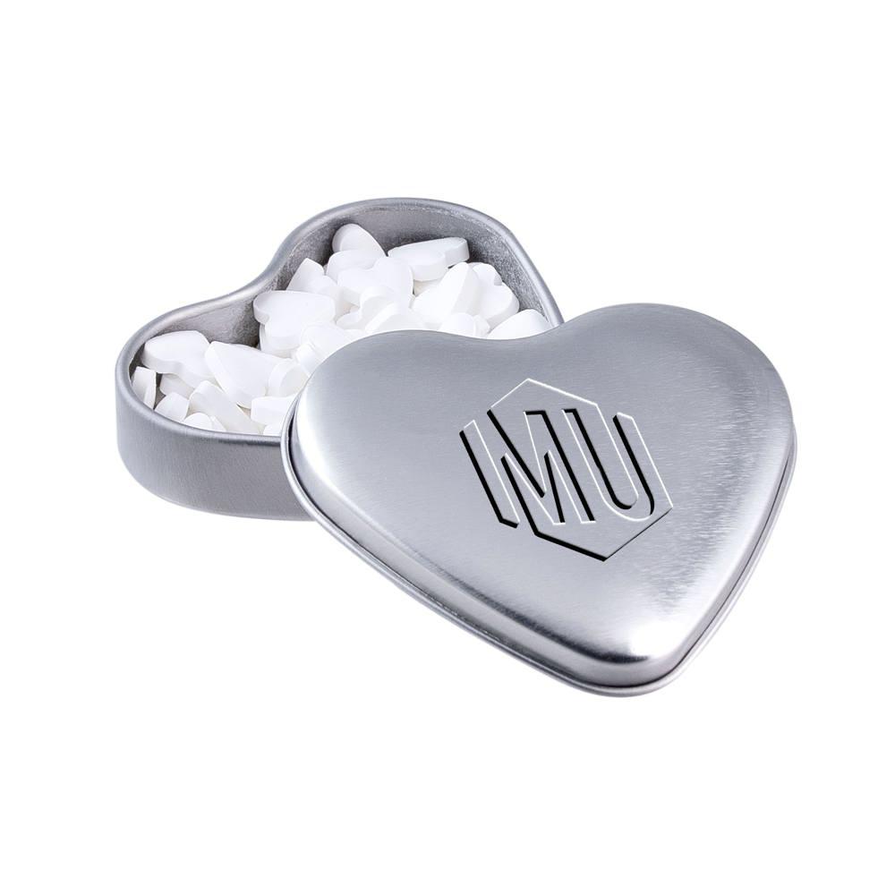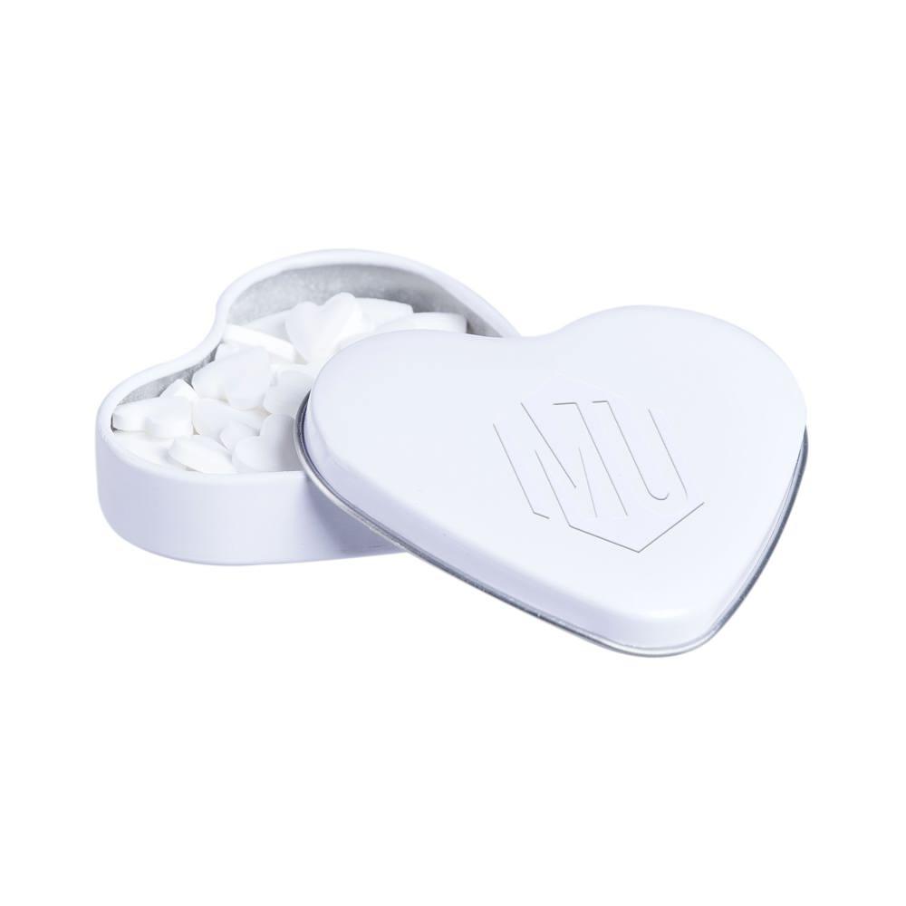 Heart-shaped tin with embossed lid, filled with approximately 23 grams of heart-shaped mints, including ingredients sticker and seal.