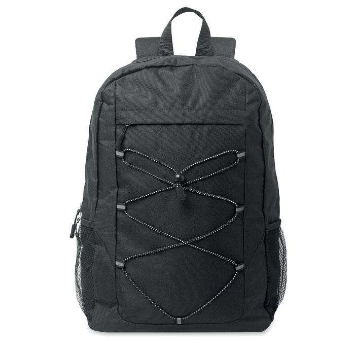 Elevate your brand visibility with our 600D RPET polyester backpack, crafted from sustainable recycled materials for eco-conscious promotional giveaways. Featuring a durable decorating cord, spacious front zippered pocket panel, and convenient mesh side pockets, this versatile backpack offers ample space for essentials, making it ideal for events, trade shows, or client appreciation gifts.