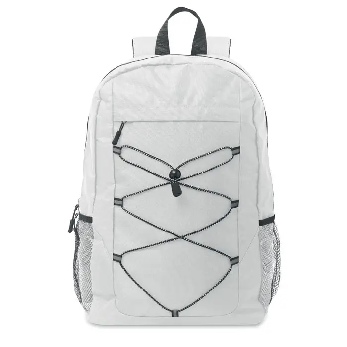 Elevate your brand visibility with the HIGE recycled polyester backpack, crafted from durable 600D RPET material for eco-conscious promotions. This sustainable alternative to traditional backpacks features a front zippered pocket panel for easy access to essentials, mesh side pockets for water bottles or umbrellas, and a decorative cord for added style.
