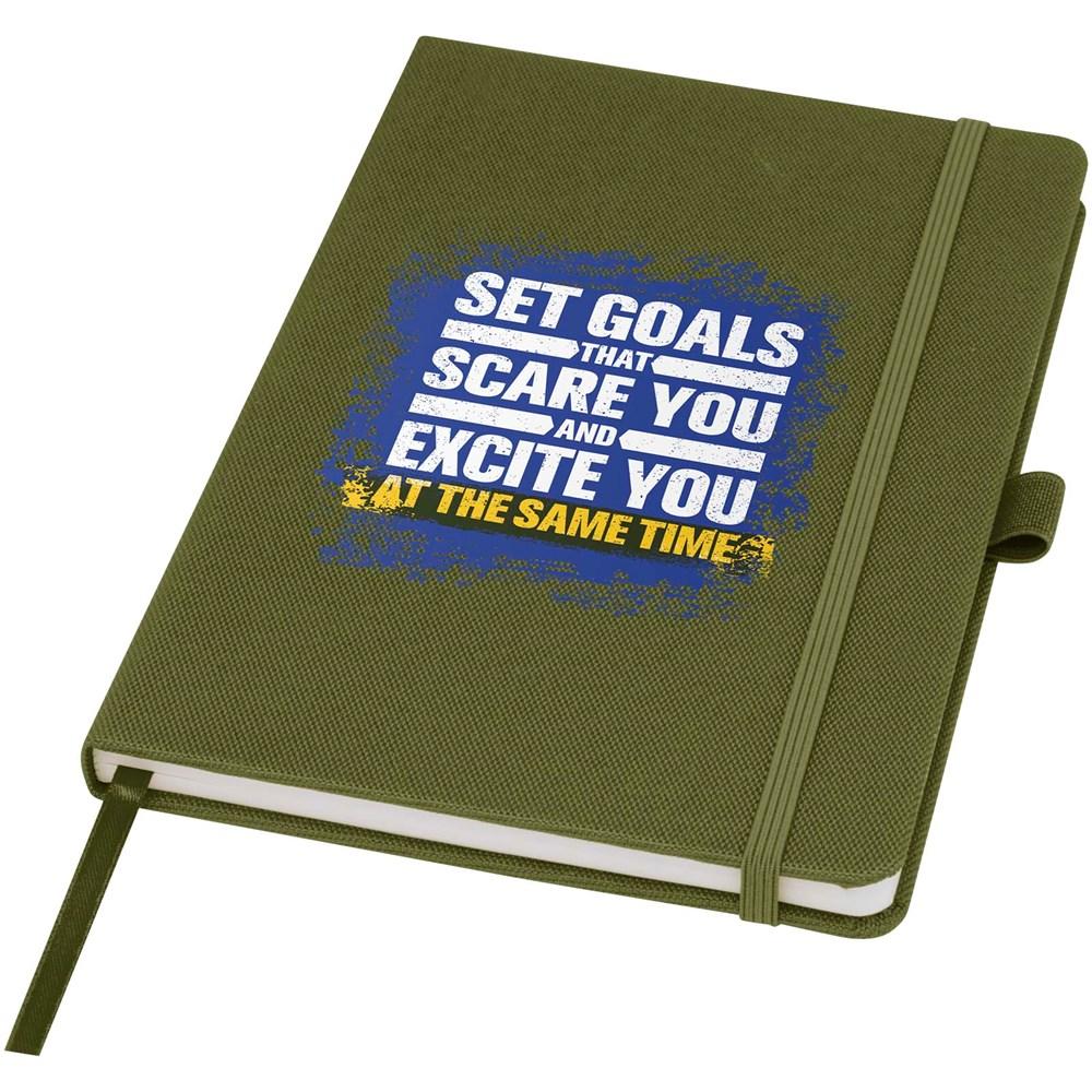 Elevate your brand with this eco-friendly A5 notebook, perfect for marketing campaigns, events, and corporate gifting. Crafted from sustainable RPET fabric for the durable cover and filled with 80 sheets of 70 g/m² recycled paper in a lined layout, it offers practicality and environmental responsibility.