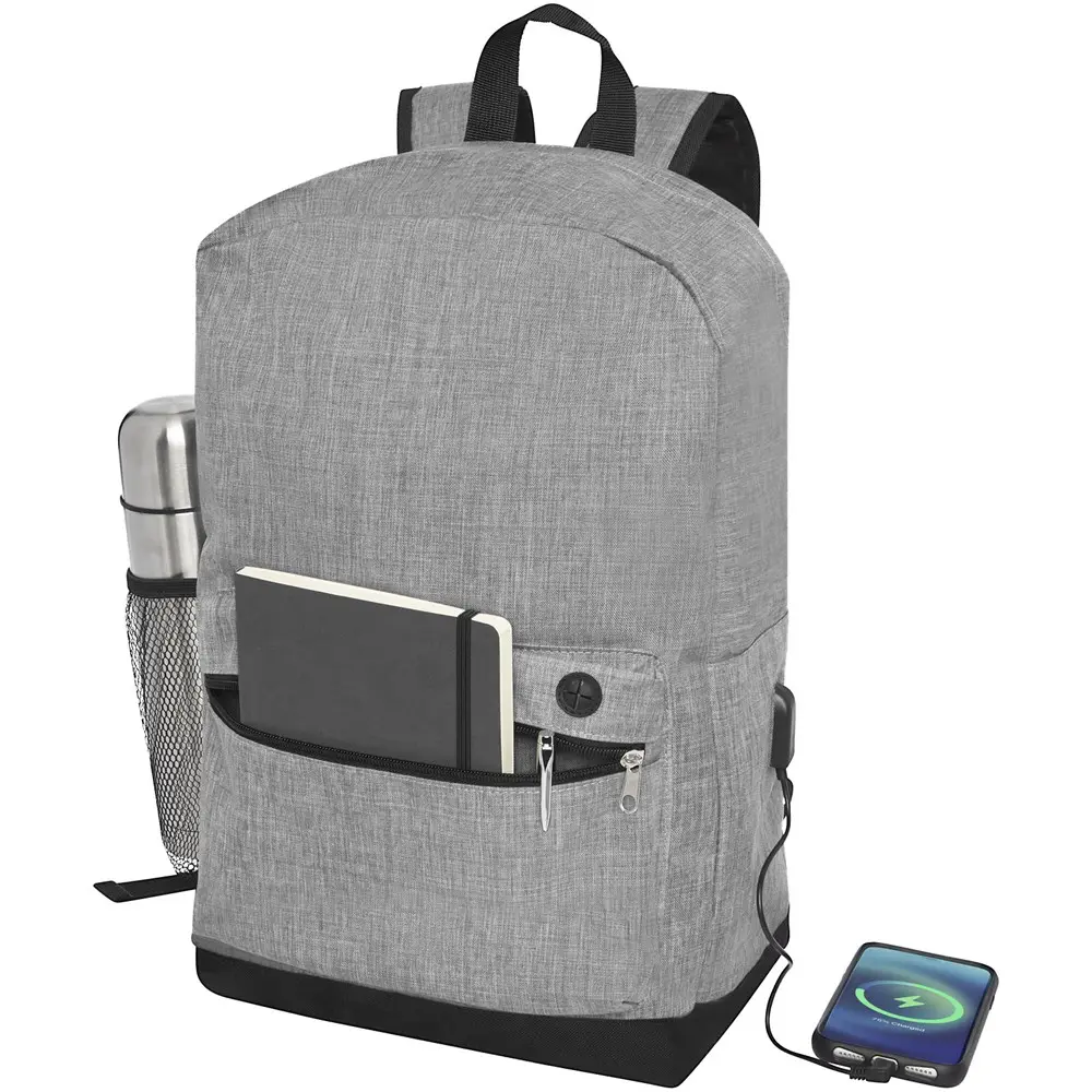 Key features include a spacious zippered main compartment with a padded sleeve for 15.6" laptops, ensuring secure protection during travel or events. A front zippered pocket provides quick access to mobile devices, while an integrated USB port with USB-A cable enhances convenience for on-the-go charging.