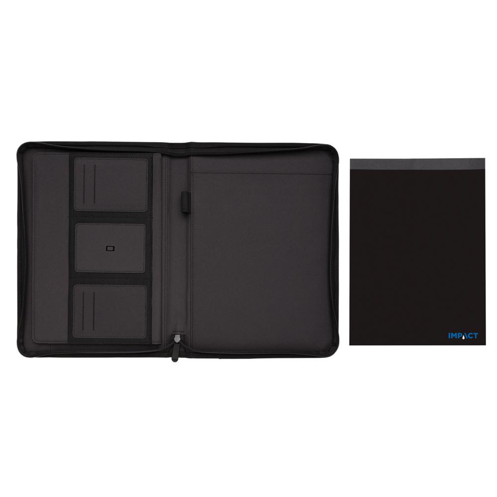 Keep work essentials organized in style: features a secure zipper closure, large sleeve pocket, dedicated phone pocket, two additional pockets, four card slots, and pen loop. Includes a FSC-certified recycled paper notepad with 20 sheets of lined, cream-colored 80gsm paper. PVC-free construction aligns with sustainable corporate values.