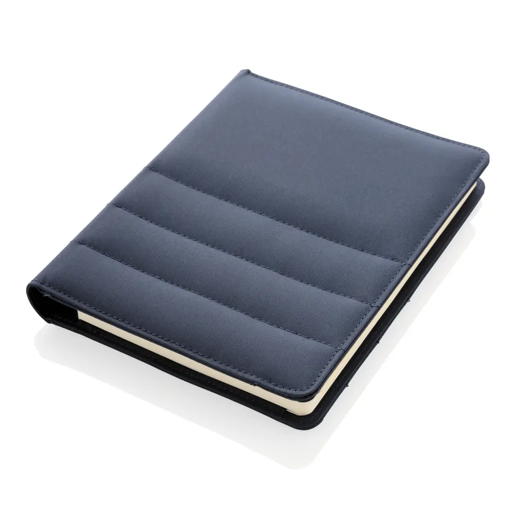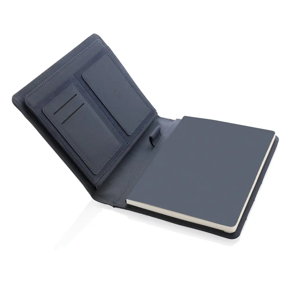 Keep essentials organized with the included A5 notebook featuring 128 lined pages of 80gsm FSC recycled cream paper. It includes a large sleeve pocket, phone pocket, two card slots, and pen loop for professional convenience. Ideal for client giveaways at events or corporate branding, this PVC-free portfolio boosts your eco-conscious image while delivering practical value.