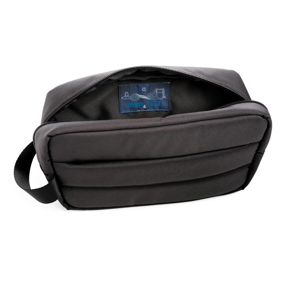 Elevate your brand's eco-image with this customizable rpet toiletry bag from the Impact collection. Ideal for marketing campaigns, events, and client giveaways, it features AWARE™ tracer technology that verifies genuine recycled materials and water savings through blockchain. Each bag saves 5 liters of water and recycles the equivalent of 9 plastic bottles, made from 100% recycled polyester inside and out.