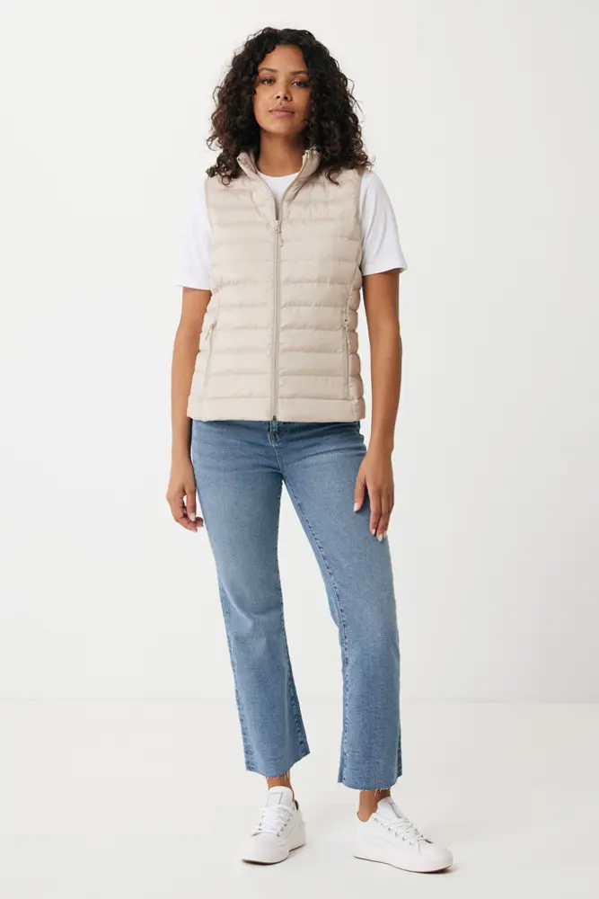 Elevate your brand with the IQONIQ Meru Women's Recycled Polyester Bodywarmer, a medium-fit essential crafted from 100% post-consumer recycled polyester. Fully quilted with 100% recycled polyester pearl filling, it features a reversed front zipper, practical side zip pockets, and elastic armhole binding for comfort and style. Clean-finished seams and fluorine/PFAS-free water repellent ensure durability and eco-responsibility.