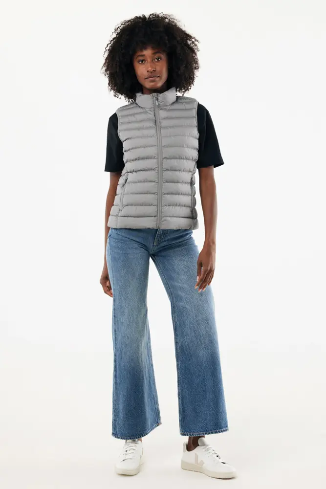 This fully quilted bodywarmer features pearl filling made from 100% recycled polyester for insulation without bulk. It includes a reversed front zipper for easy wear and practical zip pockets in the side seams to keep essentials secure. Extra zip pullers add a polished touch, while elastic binding at the armholes ensures a snug fit. Clean-finished interior seams with recycled binding enhance durability and comfort. The collar neckline provides added warmth, making it suitable for transitional weather.