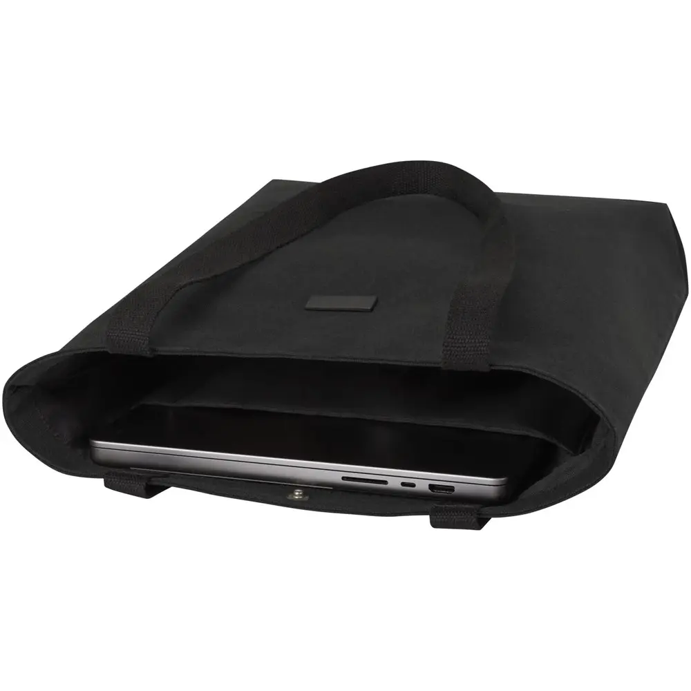 This tote bag measures 39 x 39.5 x 11 cm, offering 14L of spacious capacity perfect for daily essentials. It includes a padded compartment for a 15" laptop, ensuring safe transport for professionals on the move. Inside, two sleeve pockets keep phones, wallets, and accessories organized and accessible. The easy button closure secures contents, while comfortable cotton webbing handles provide a reliable grip for effortless carrying. A decorative metal plate adds a subtle, matte finish that highlights your logo without overpowering the design.