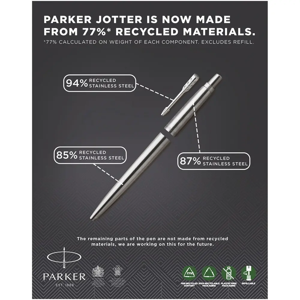 Elevate your brand with the iconic Parker Jotter ballpoint, a timeless design staple for over 60 years. Crafted from durable stainless steel, this sleek pen features a distinctive shape and signature click mechanism, ensuring instant recognition and memorable impressions.