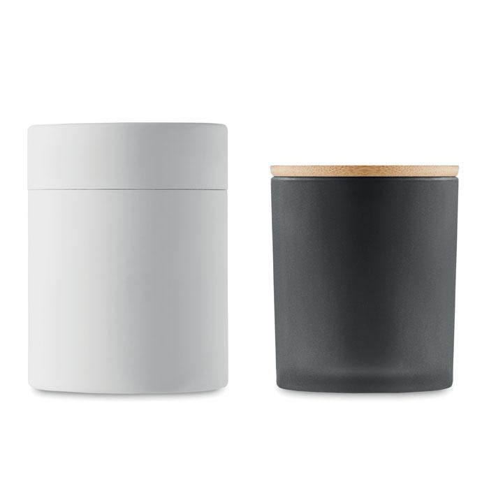 Elevate your brand with this premium fragranced plant based wax candle, perfect for custom logo printing as a promotional giveaway. Housed in a stylish frosted glass jar with a sustainable bamboo lid, it weighs 280 gr and offers an impressive 46-hour burn time for extended enjoyment.