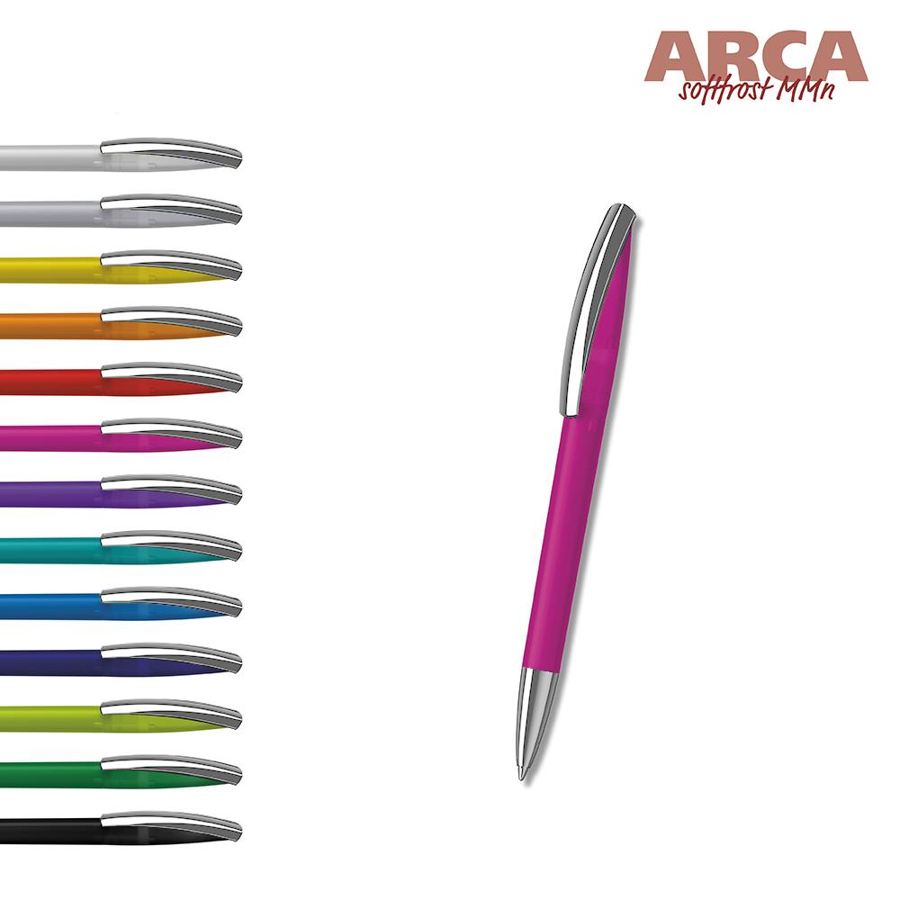Discover the Arca softfrost MMn twist action ballpoint pen, an ideal choice for personalized promotional giveaways. Its ergonomic rubberised softfrost surface on a durable plastic barrel provides exceptional writing comfort, making it perfect for extended use during events or daily client interactions.
