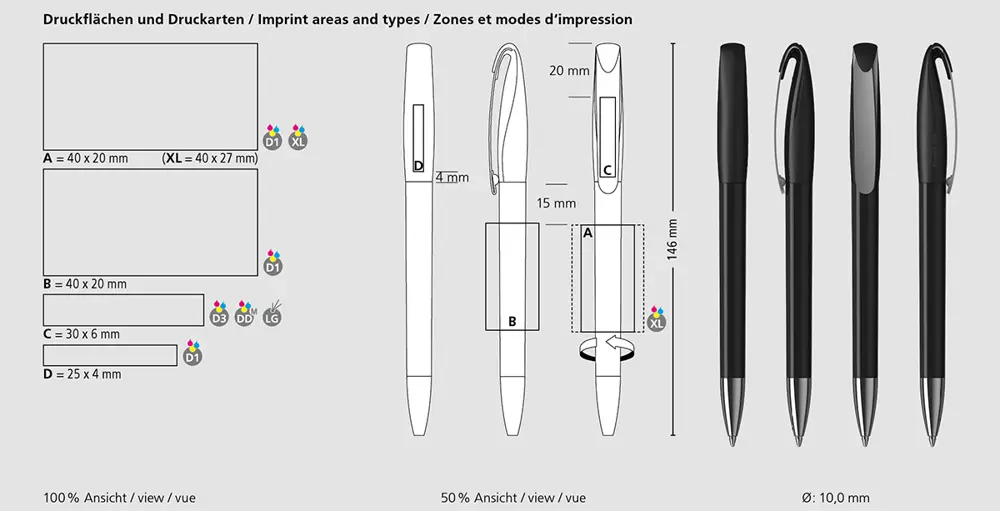 Crafted from high-quality plastic (ABS) with a glossy finish, this pen features a brass nickel-plated tip and a spring steel nickel-plated clip. The mix of matte and shiny surfaces on the upper barrel adds a sophisticated touch. Measuring 146 mm in length and 10 mm in diameter, it provides a comfortable grip for everyday use, ensuring your brand message remains visible longer.
