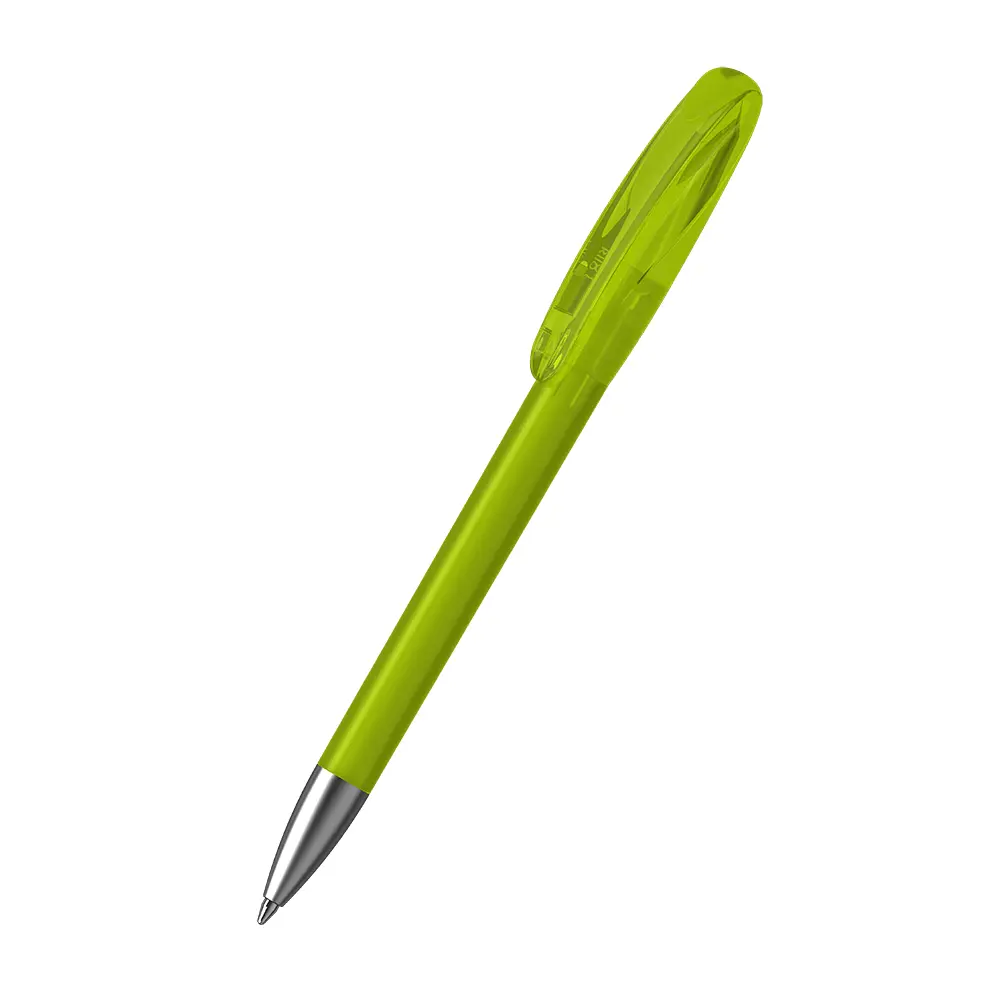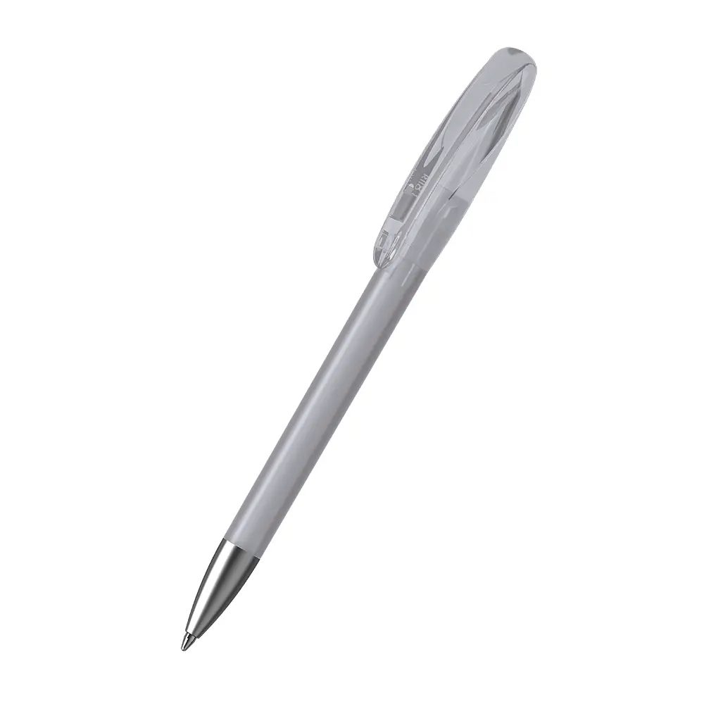 This pen features a smooth twist mechanism for effortless writing. The barrel combines frosted plastic for a modern matte finish with metallic accents on the tip, crafted from brass with satin chrome plating. The upper barrel blends matte and shiny surfaces, creating a dynamic visual appeal without compromising functionality. Standard options allow for versatile combinations to match your branding needs.