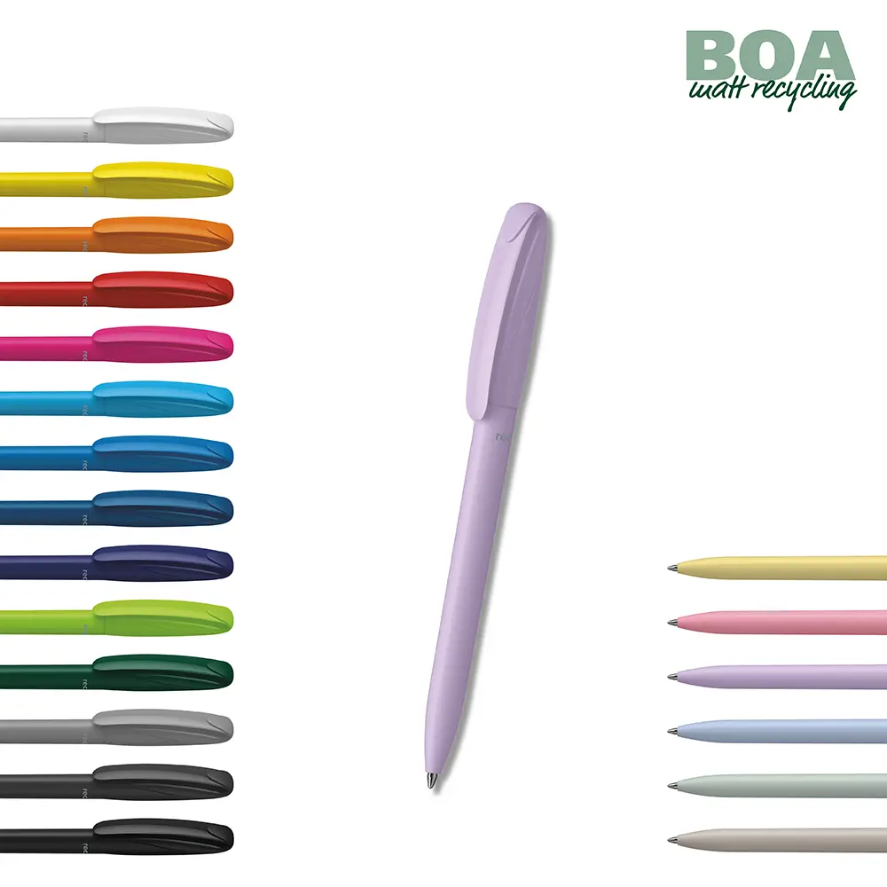 Elevate your brand with the Boa Matt Recycling Twist Action Ballpoint Pen, a sustainable choice crafted from recycled plastic (rABS and rPOM). This eco-friendly promotional pen features a flowing, modern design with a mix of matte and shiny surfaces for a premium feel. Ideal for marketing professionals and event organizers, it's perfect for large-scale customization with your logo to boost visibility and demonstrate your commitment to sustainability.