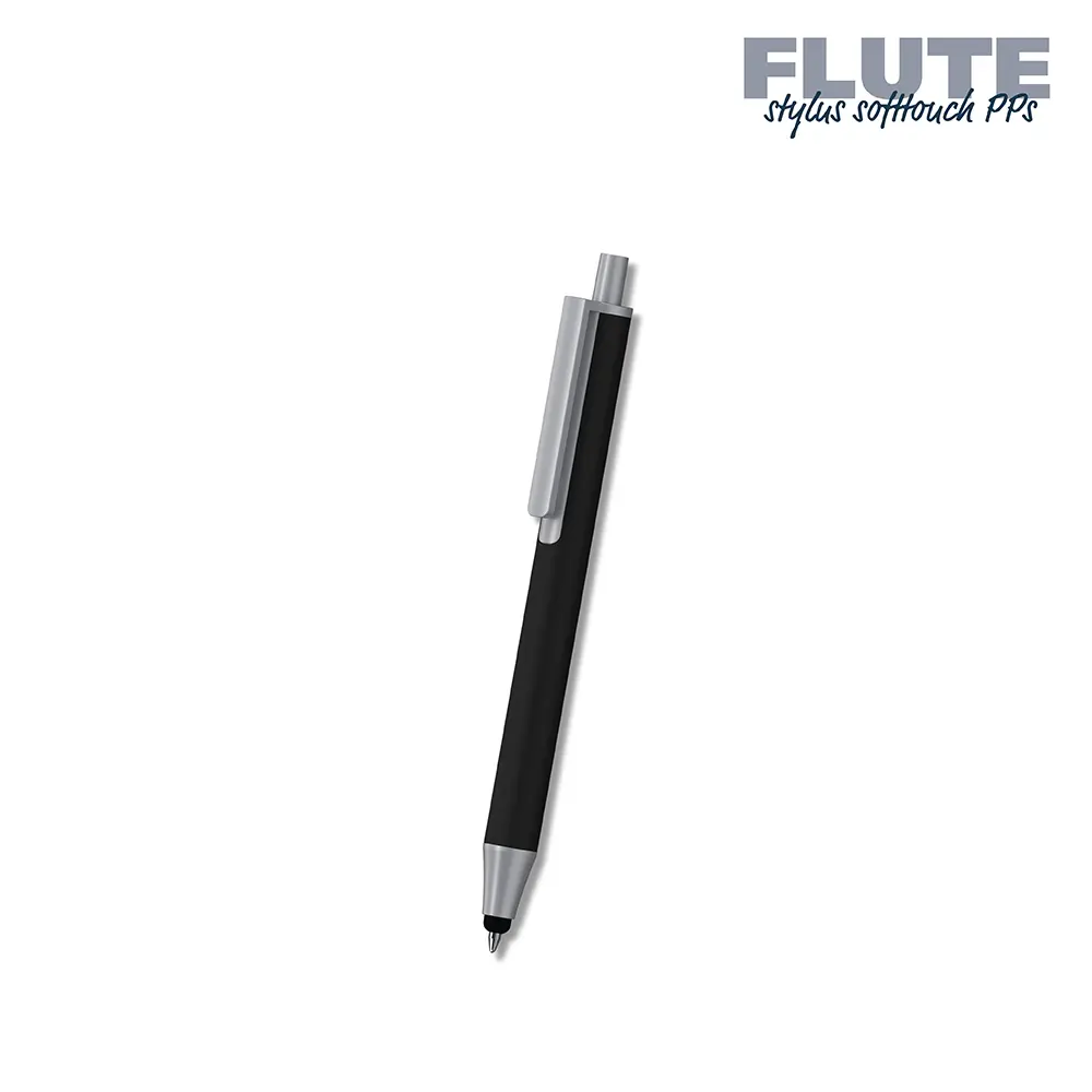 Elevate your brand visibility with the Flute stylus softtouch PPs, a versatile retractable ballpoint pen featuring a stylus tip for seamless touchscreen use. Crafted from durable aluminium with a comfortable rubberized softtouch barrel, it ensures a premium grip and reliable performance, backed by a high-quality refill for up to 3,000 meters of smooth writing.