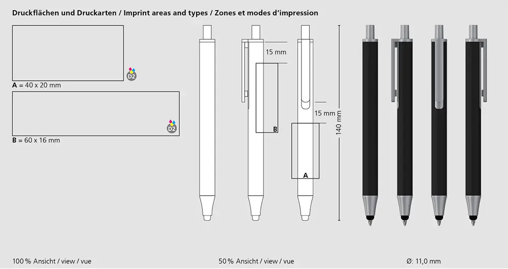 Ideal for marketing professionals and event organizers, this pen offers ample space for custom logo imprinting, making it a perfect promotional giveaway to impress clients and boost engagement. Its slim 140 mm length and 11 mm diameter provide a sleek, portable design that's made in Europe for quality assurance, helping you deliver memorable, branded experiences.