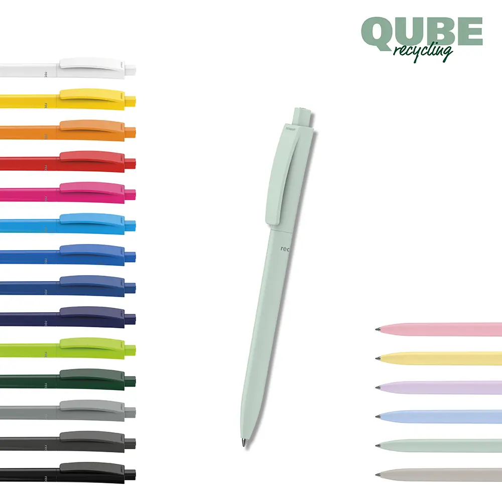 Elevate your brand's eco-conscious image with the Qube Recycling retractable ballpoint pen, crafted from high-gloss recycled plastic (rABS) for the barrel, upper barrel, and push button, paired with a recycled plastic (rPOM) mechanism. This sustainable promotional tool features a sleek, geometric design with a 10mm diameter, making it comfortable for everyday use and perfect for customization with your logo.