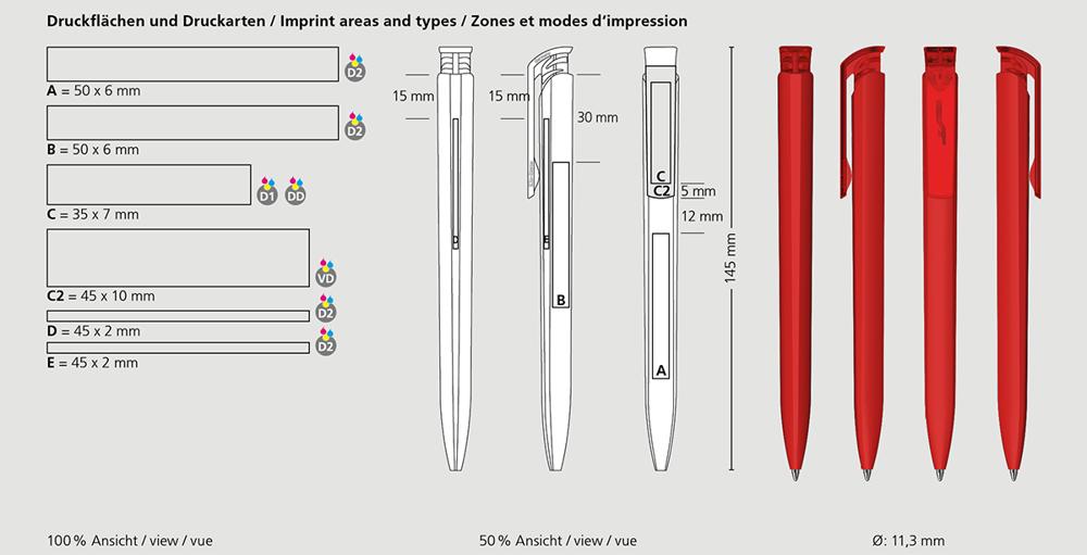 Crafted from durable plastic with a transparent push-button clip, this pen combines sleek design and functionality. The high-quality Silktech L refill (3,000 meters writing length) delivers smooth, reliable ink flow in blue or black, while recycled polypropylene refill tubes add an eco-friendly touch that appeals to sustainability-conscious audiences.