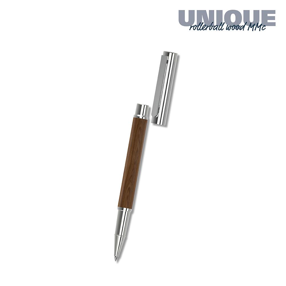 Elevate your promotional giveaways with the Unique rollerball wood MMc, a premium rollerball pen featuring a nutwood barrel paired with chromed brass tip, cap, and steel clip for a sophisticated, natural appeal.