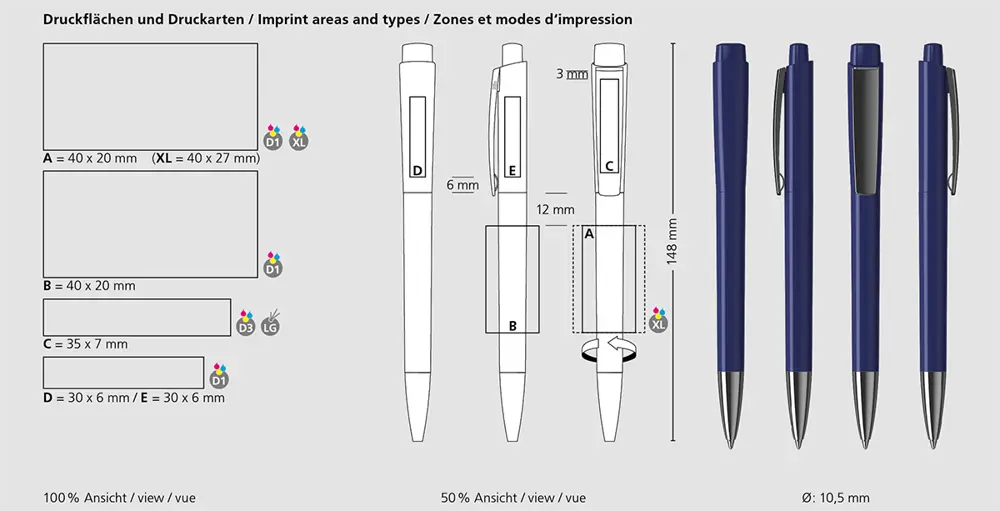 Produced in Europe, this pen aligns with eco-conscious practices, offering a sustainable option for promotional giveaways without compromising on style or functionality. Learn more about our European production and ecological choices.