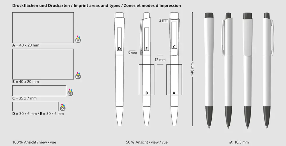 Crafted from durable plastic (ABS), the pen features a rubberized softtouch surface on the barrel and upper barrel for a comfortable grip, paired with high gloss elements on the tip and push button for a premium finish. Measuring 148 mm in length and 10.5 mm in diameter, it offers a sleek profile that's easy to carry and distribute.