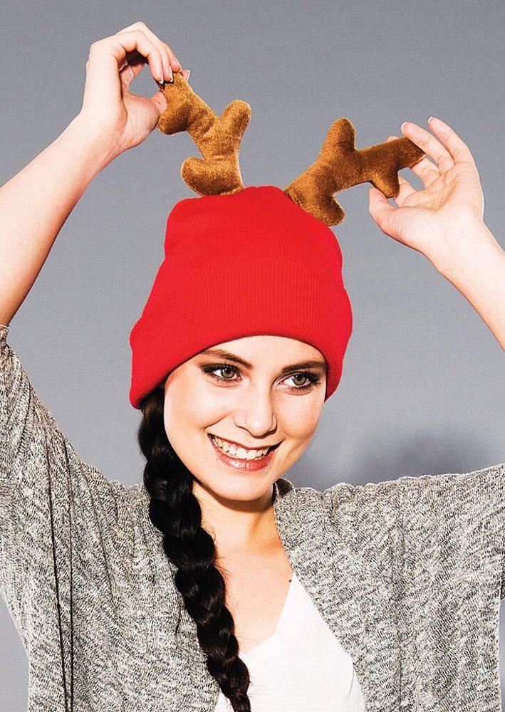 Elevate your brand's holiday presence with this cozy 100% acrylic knitted reindeer hat, ideal for bulk customization with your company logo. Perfect for marketing teams and event organizers handing out memorable giveaways at Christmas parties, corporate events, or client appreciation campaigns.