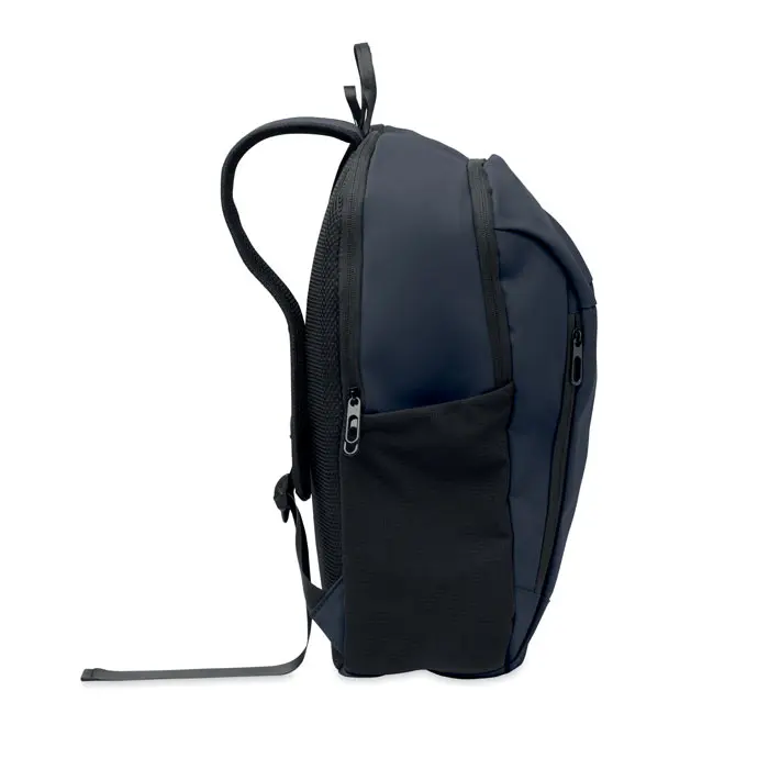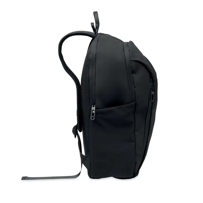 This backpack features a padded back for comfort and a hidden zippered main compartment to securely hold a 15-inch laptop. It includes one zippered front pocket for quick access to essentials, two front side zippered pockets for organized storage, and two elastic mesh side pockets ideal for bottles or umbrellas. The interior is lined with 210D RPET for added durability and eco-conscious appeal.