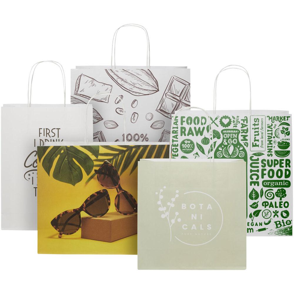Elevate your brand visibility with our Kraft 120 g/m2 paper bag with twisted handles - 31 x 12 x 25 cm, a spacious and sturdy choice for promotional packaging. Crafted from durable 120 g/m2 kraft paper with reinforced twisted paper handles, this large bag (31 x 12 x 25 cm) effortlessly carries heavier items while offering generous front and back panels for full-color logo printing or custom designs.