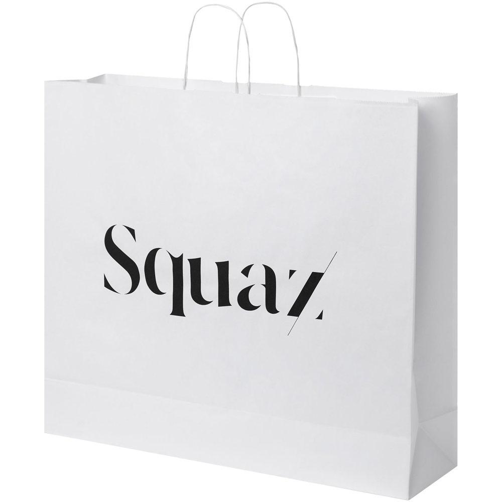 Elevate your brand's visibility with our XXL kraft paper bags featuring twisted handles (49.5 x 14 x 44 cm). Crafted in Europe from responsibly sourced 90-100 g/m² paper, these durable, eco-friendly carriers offer generous space for promotional items, gifts, or event swag, making them ideal for bulk customization with your logo.