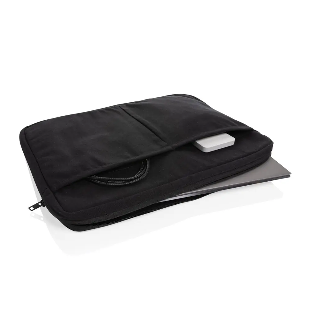 Elevate your brand's eco-friendly image with the Laluka AWARE™ recycled cotton laptop sleeve, designed for 15.6-inch laptops. Crafted from sustainable recycled cotton twill (340gsm), this stylish sleeve combines fashion and environmental responsibility, featuring a padded interior pocket for secure protection and two front pockets for organized essentials.