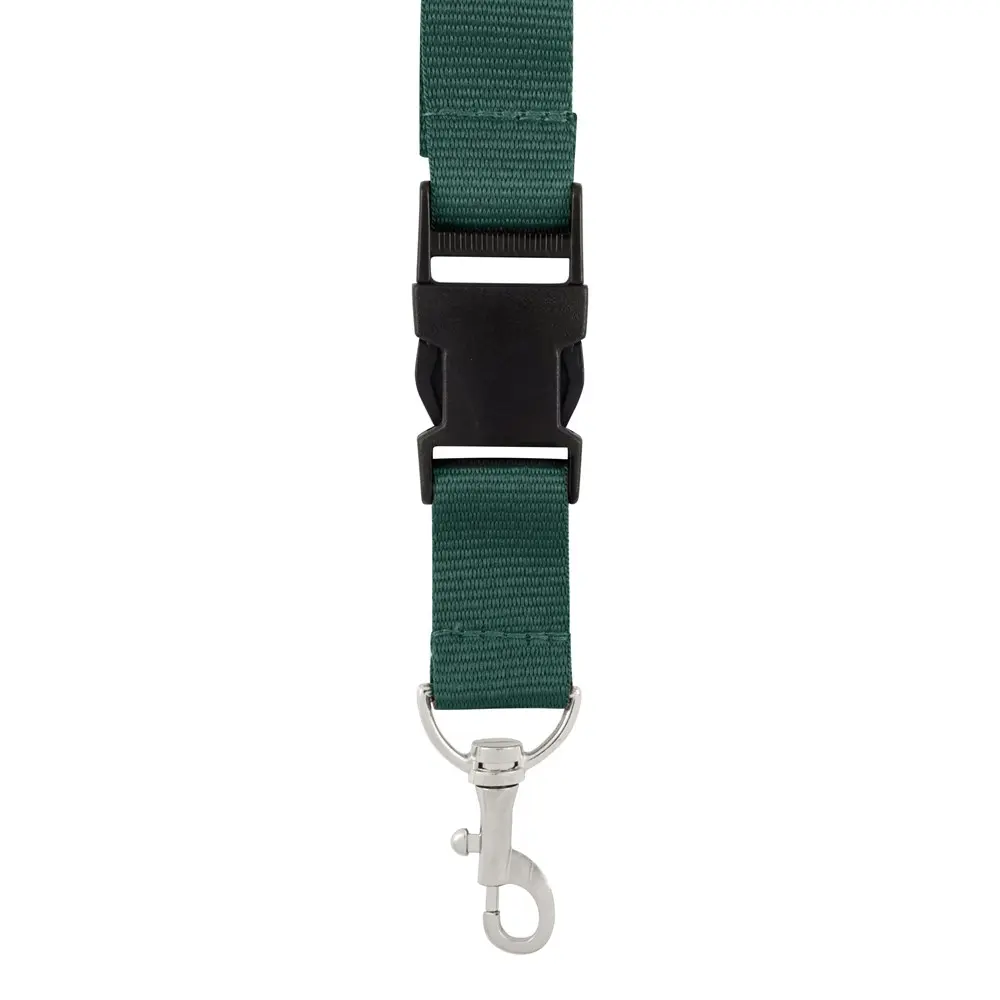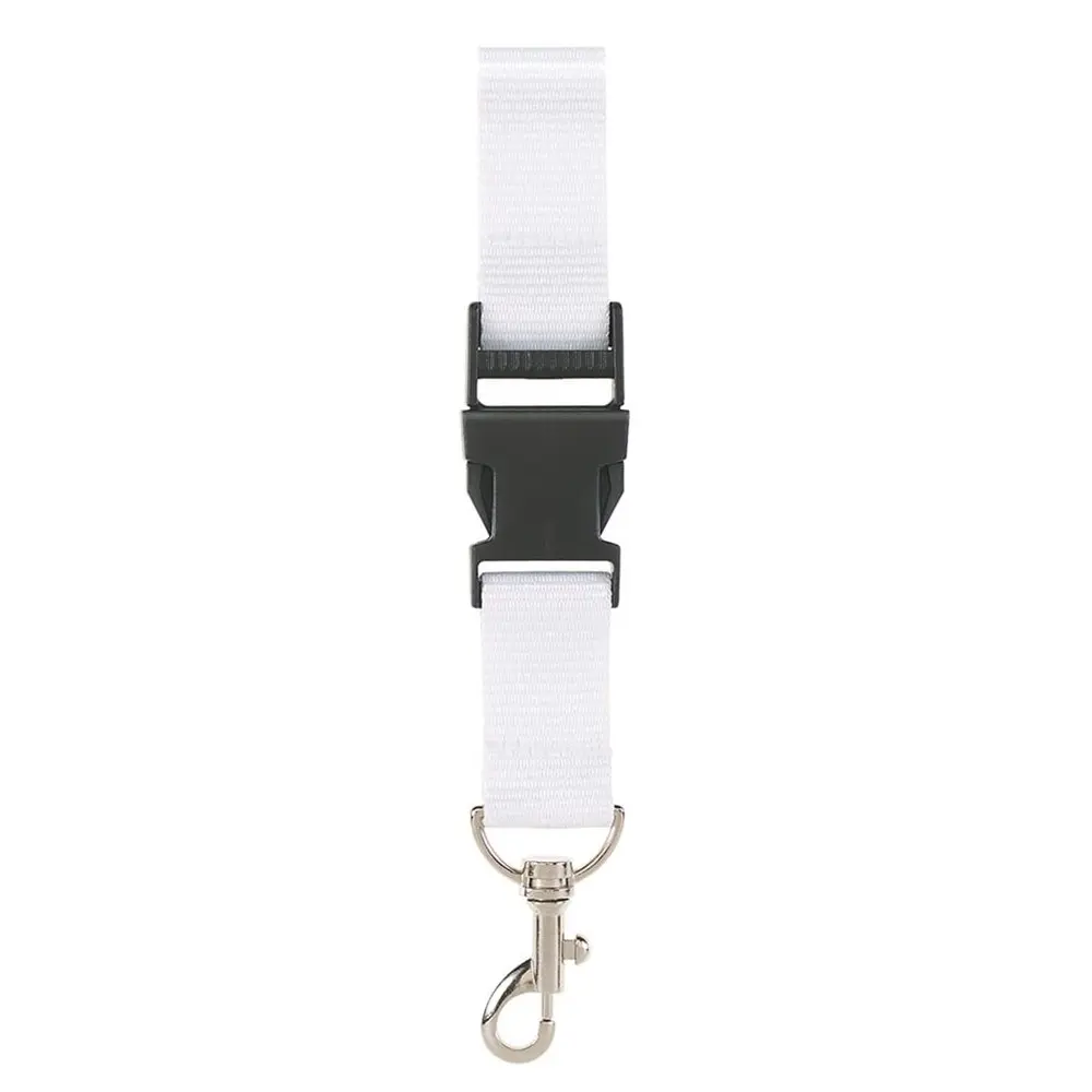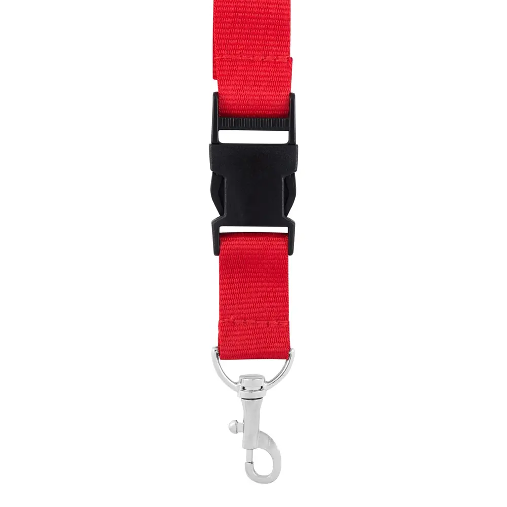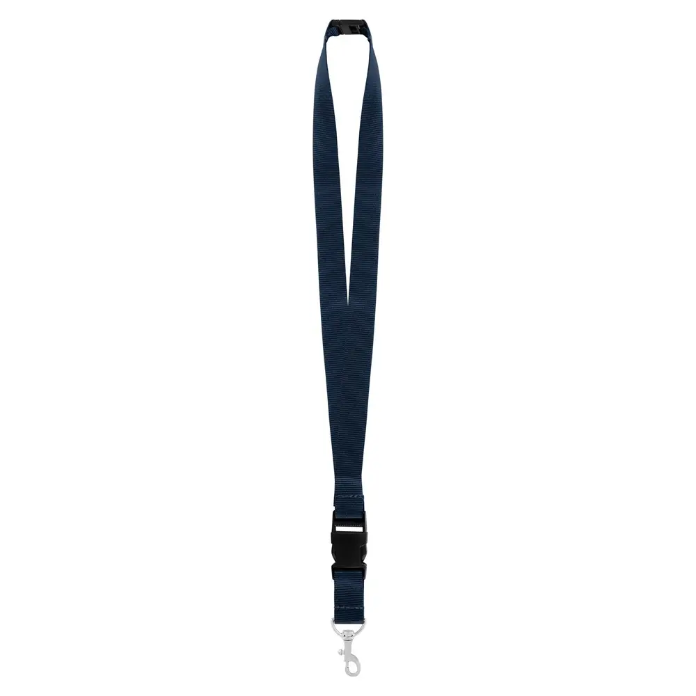 Lanyard with safety break, plastic buckle closure and carabiner. 100% polyester, 2,5 cm wide.