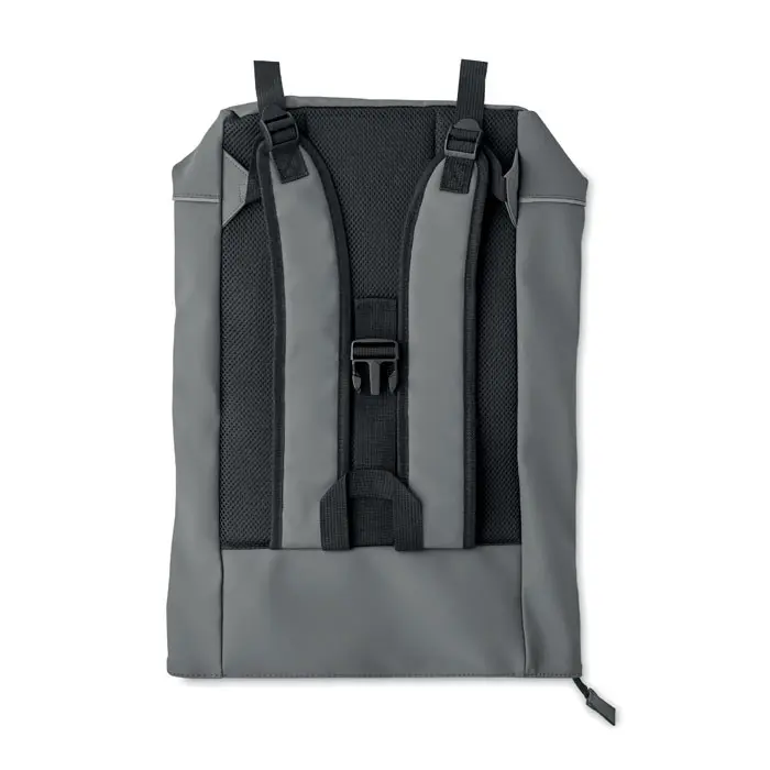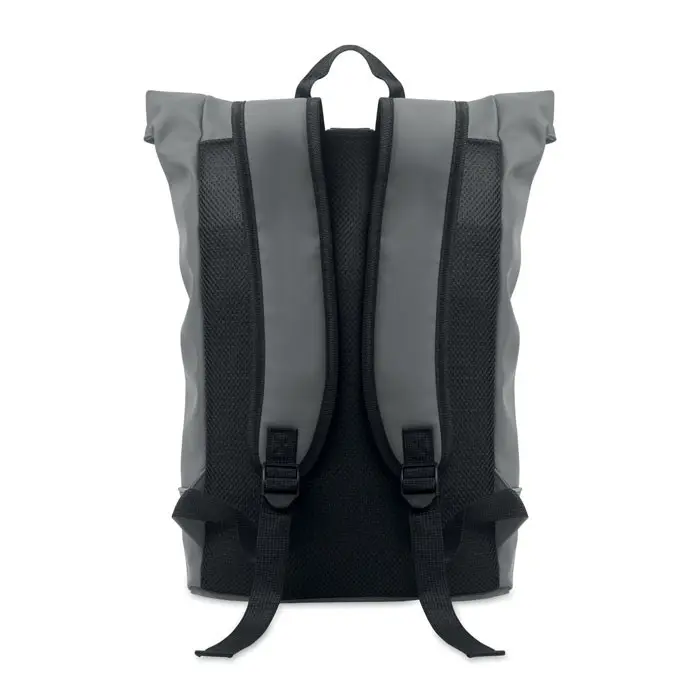 This backpack features a secure roll top closure for easy access and adjustable capacity. The padded back panel ensures comfort during long commutes or events, while the reinforced base protects your laptop from daily wear. A reflective strip enhances visibility in low-light conditions, making it ideal for outdoor activities. The waterproof zippered front pocket keeps essentials dry and organized, and the interior is lined with 210D RPET polyester for added protection.