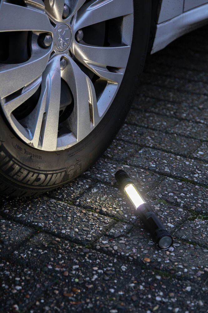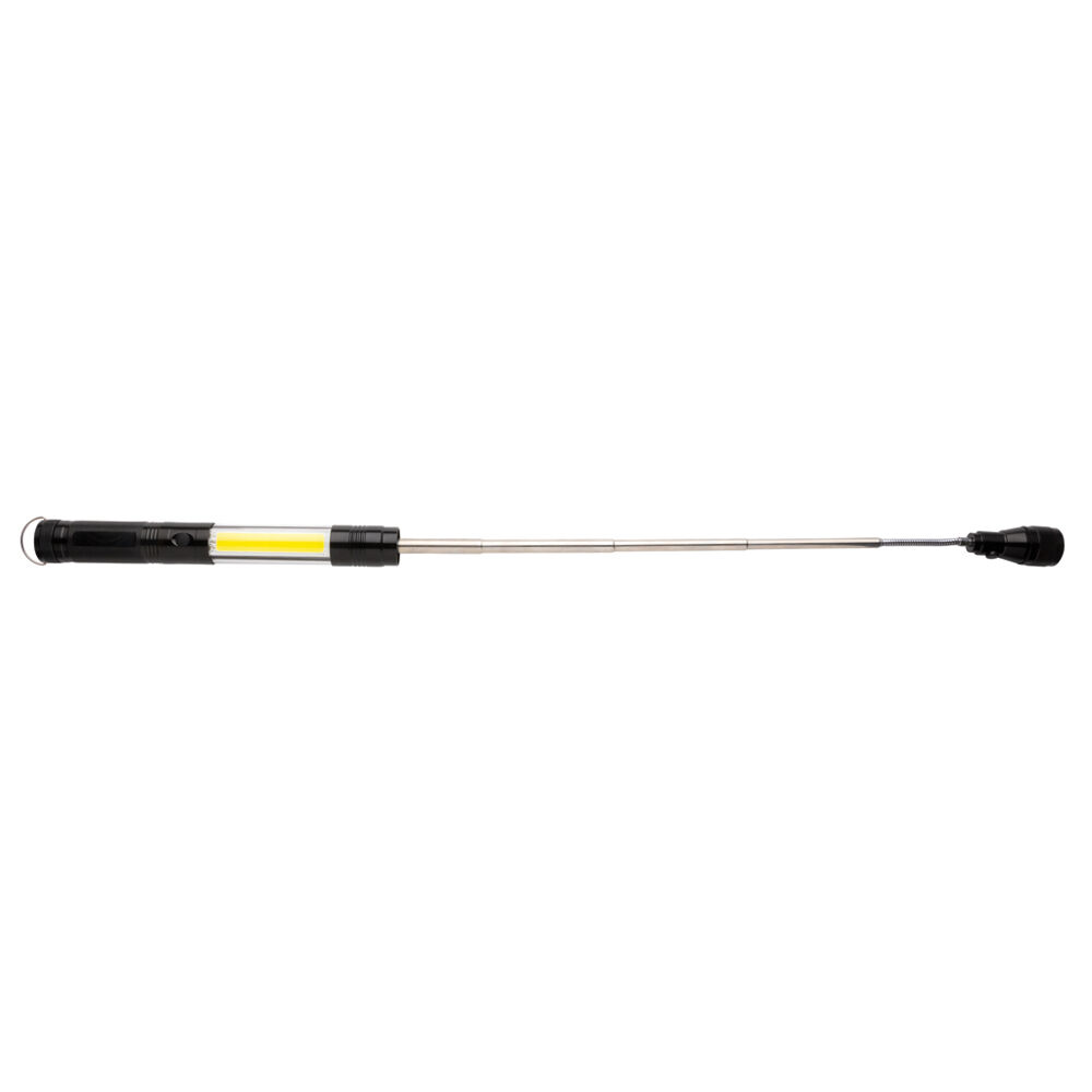 Enhance your brand visibility with our Large Telescopic Light with COB, a versatile promotional tool ideal for marketing professionals and event organizers. This double magnetic LED work light attaches securely to metal surfaces, providing hands-free illumination for workshops, events, or fieldwork. Crafted from durable aluminum, it extends from 26 cm to 64 cm, with a flexible head that adjusts in any direction for precise lighting. The front magnet retrieves small metal items from tight spots, while three bright LEDs deliver focused exposure, and the 80-lumen COB light floods dark areas with reliable brightness. Powered by button cell batteries (included), it ensures immediate usability. Perfect for bulk customization with your logo, this practical giveaway boosts client appreciation and reinforces your company's innovative image. Compliant with key EU safety directives for peace of mind. Packaged in a gift box for professional presentation.