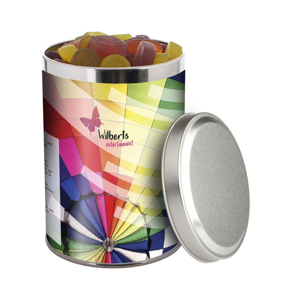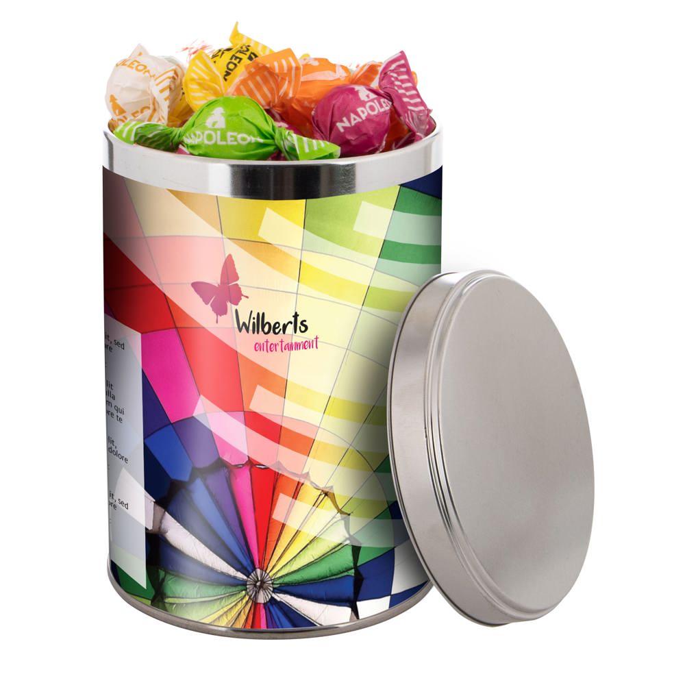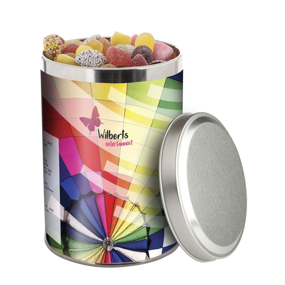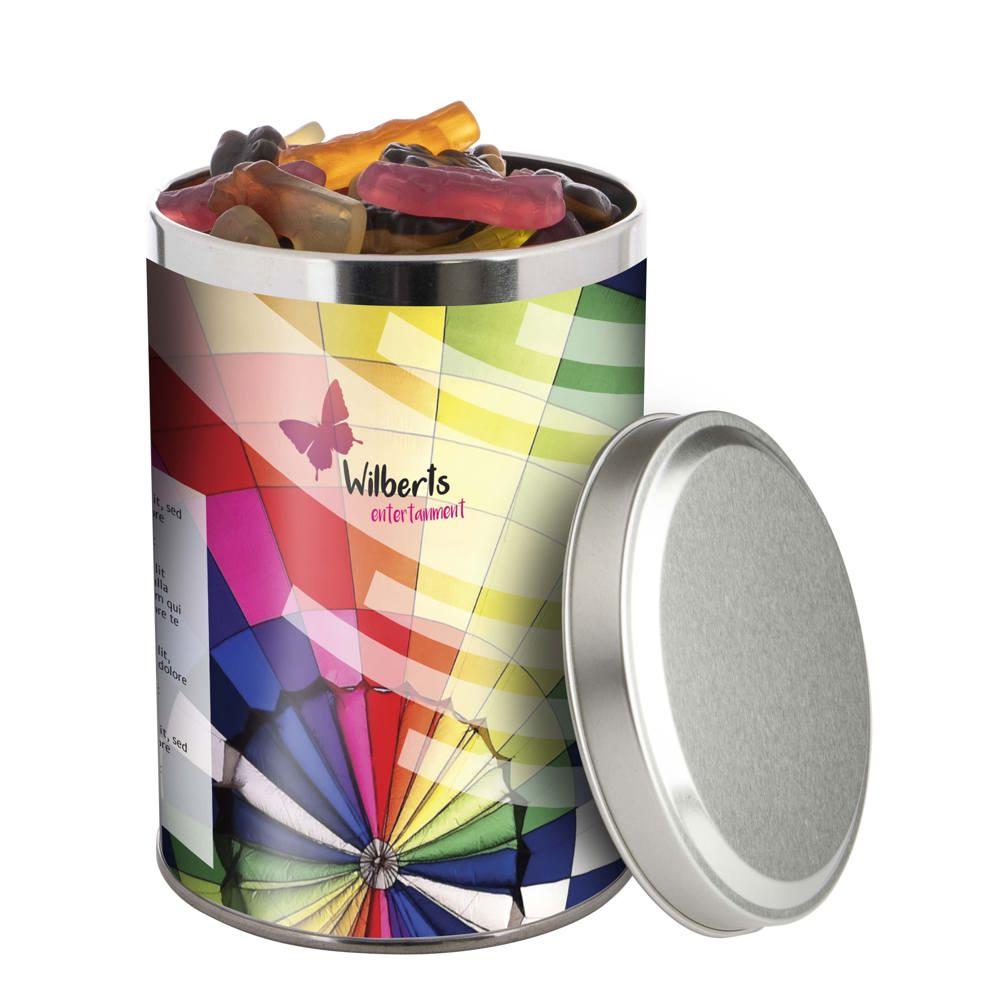 Elevate your brand visibility with our large 1.3-liter promotional tin, featuring a customizable full-color printed sleeve perfect for your logo or event branding. Filled with approximately 485 grams of metallic sweets, this spacious can (108 mm diameter) delivers a generous treat that delights recipients and keeps your message front and center.