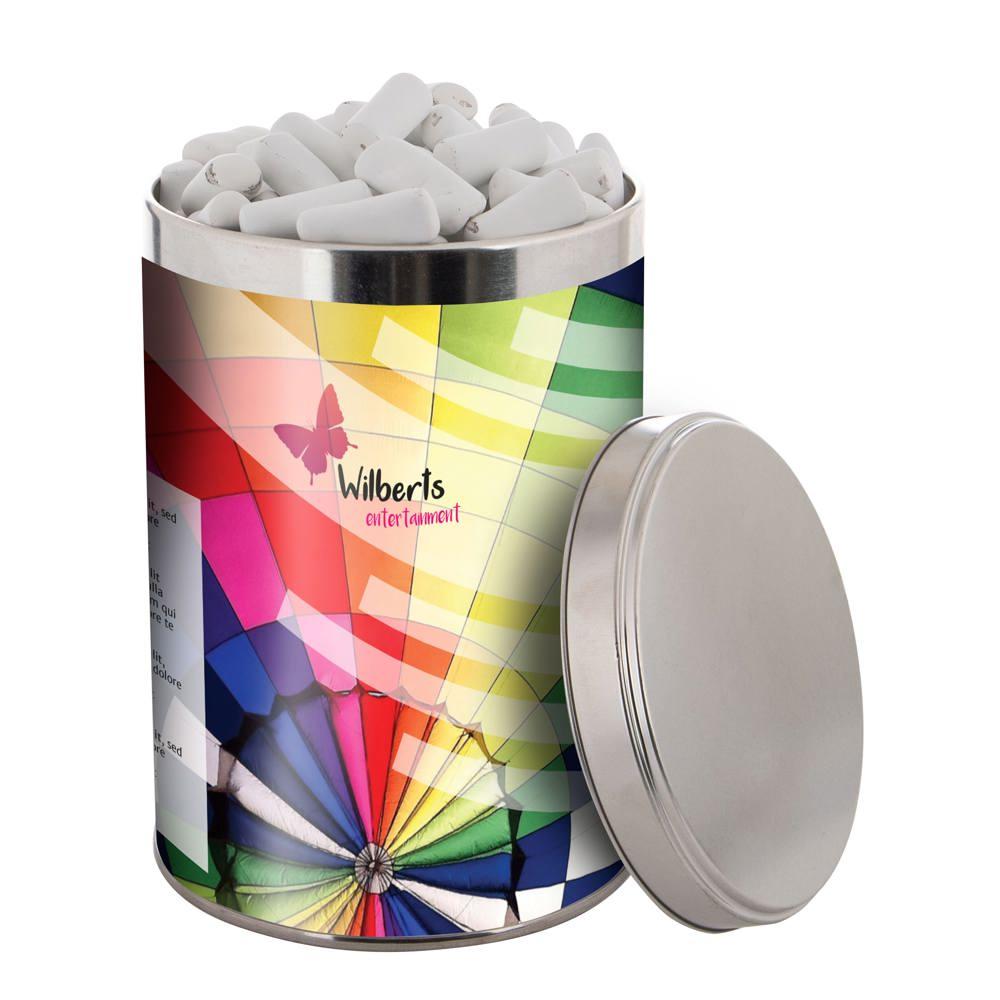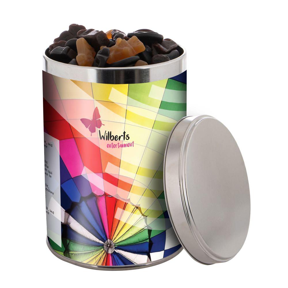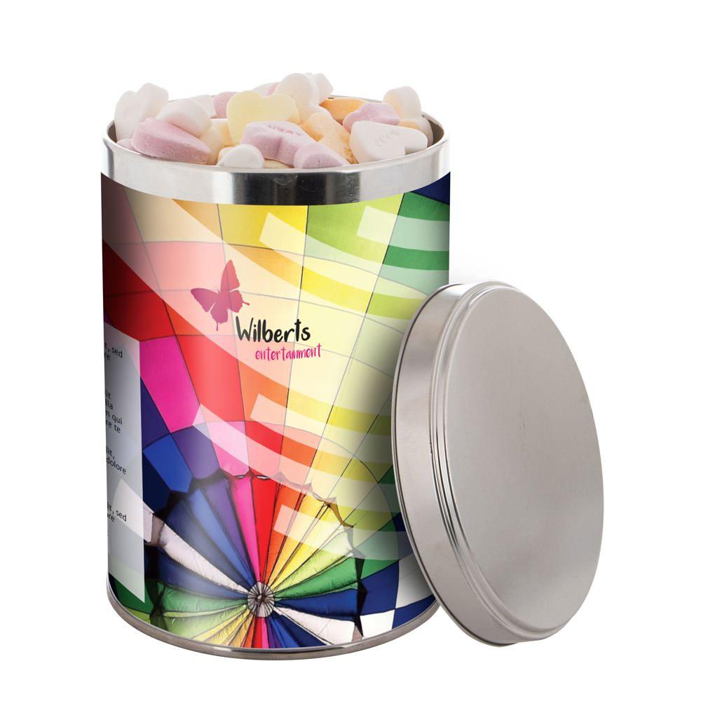 Elevate your brand visibility with this spacious 1.3 liter tin, featuring a fully customizable full color printed sleeve for your logo or design. Filled with approximately 485 grams of metallic sweets, it offers substantial value as a standout giveaway.