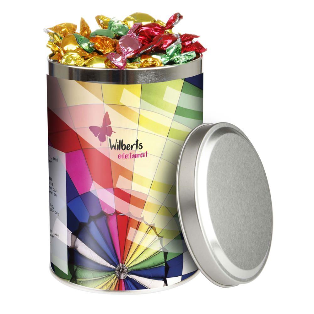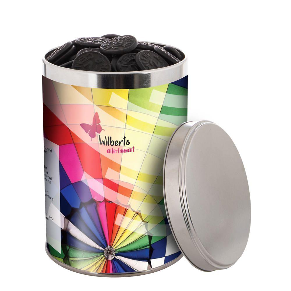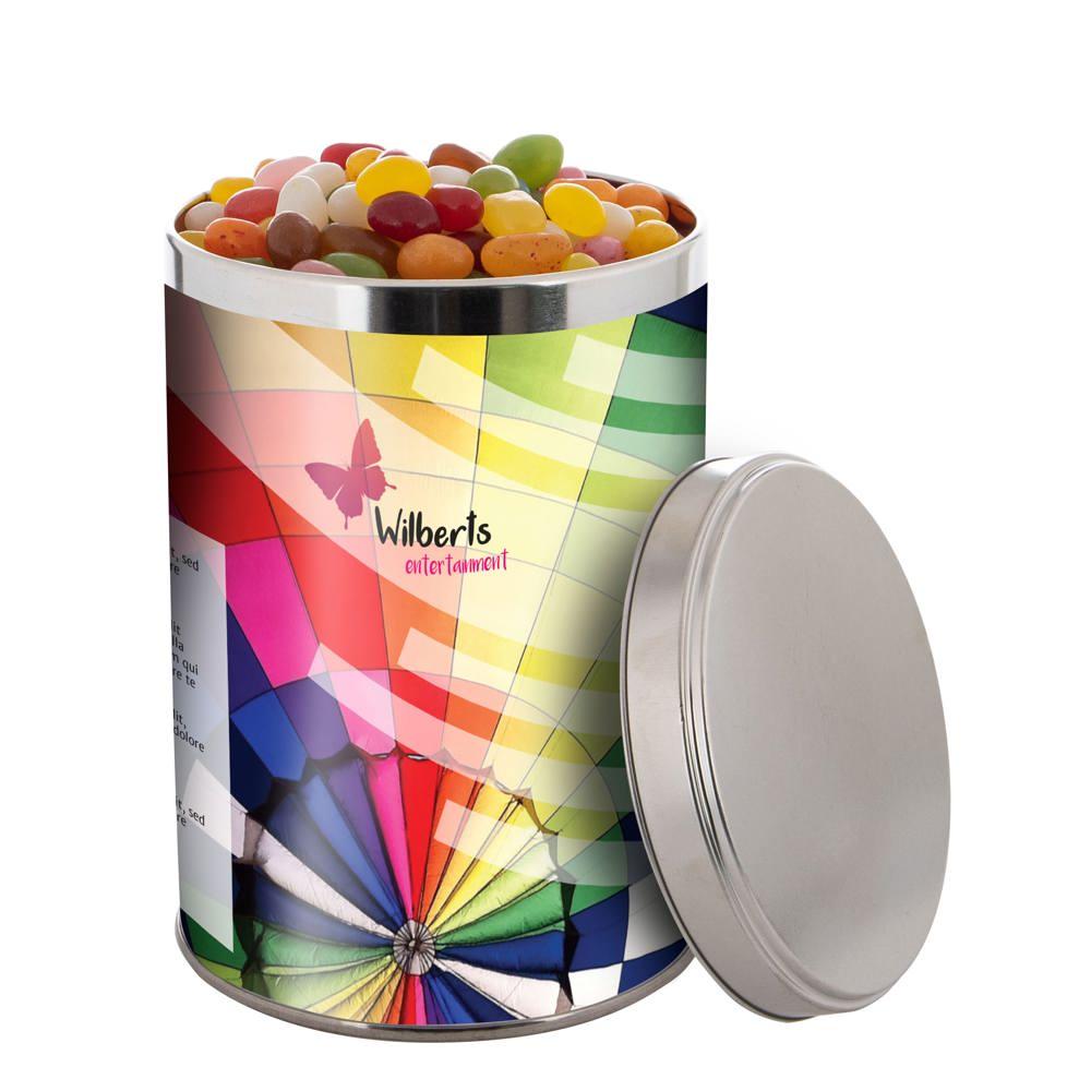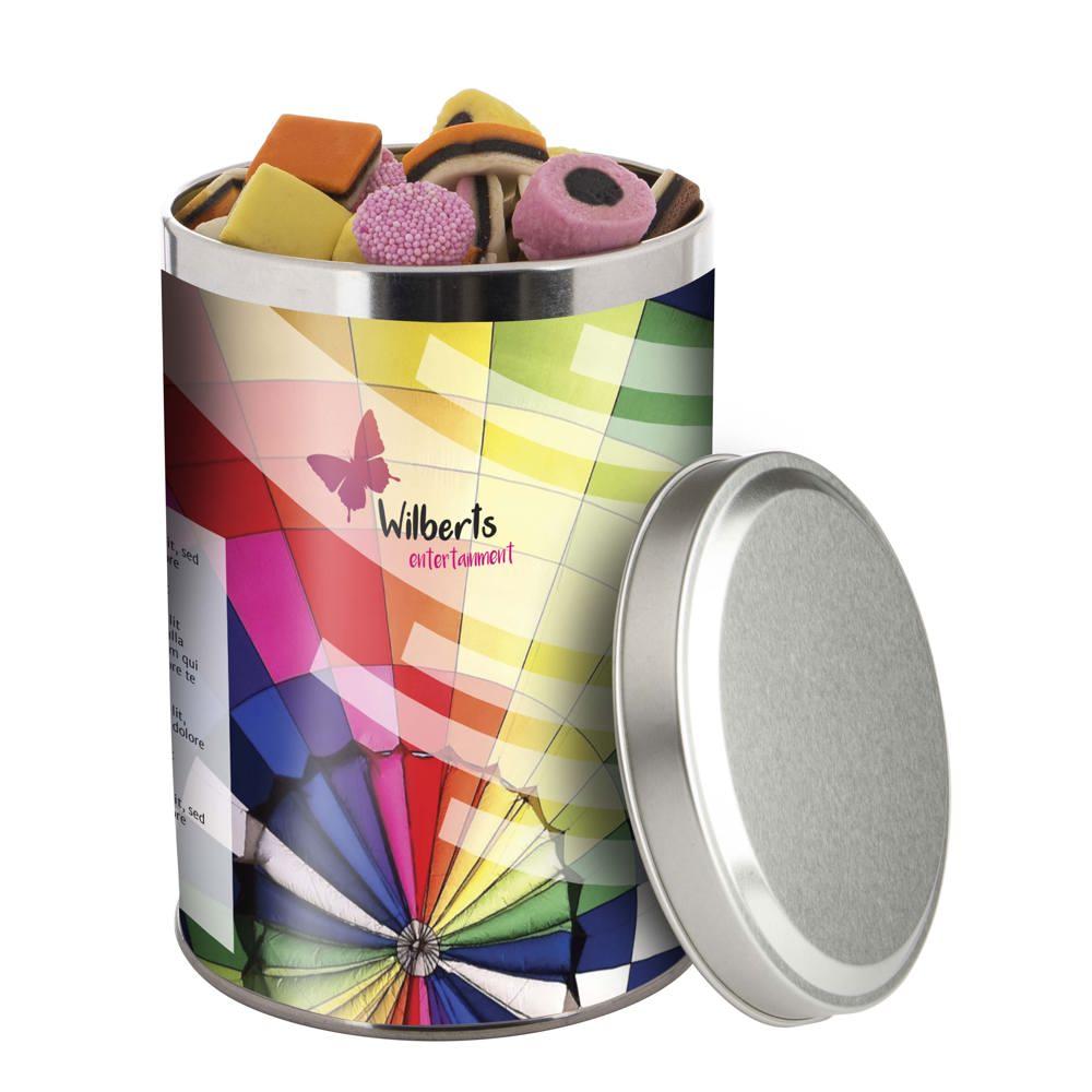 Elevate your brand visibility with this spacious 1.3 liter tin, featuring a fully customizable full color printed sleeve for your logo or design. Filled with approximately 485 grams of metallic sweets, it offers substantial value as a standout giveaway.