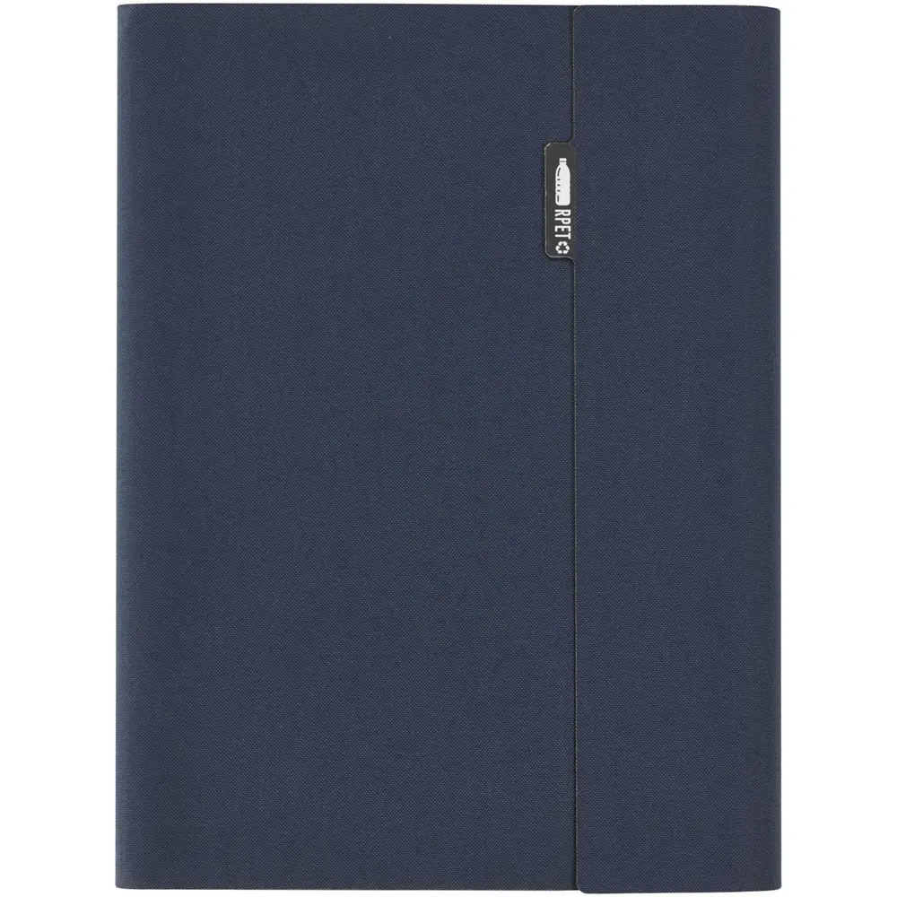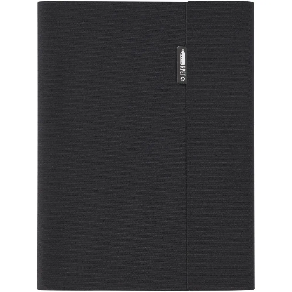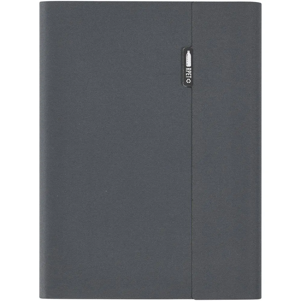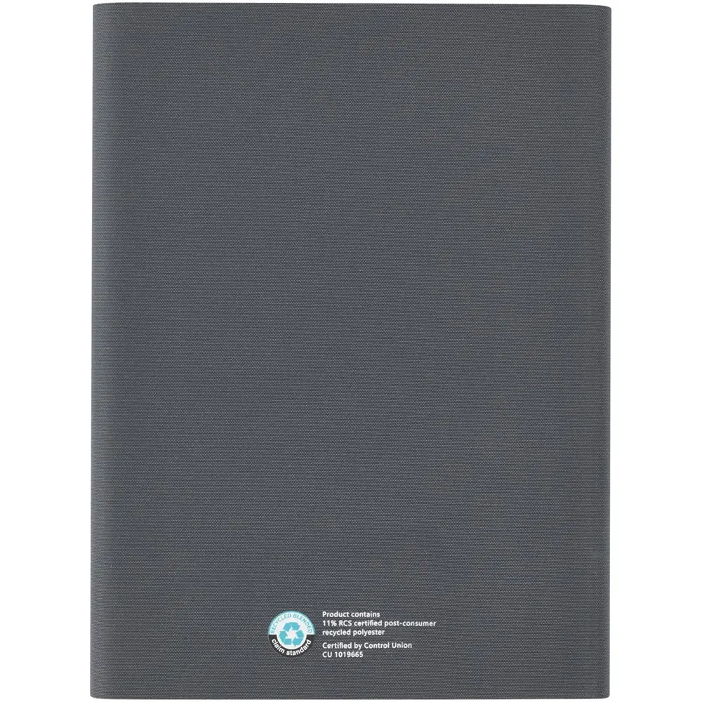 Elevate your brand's eco-friendly image with the RCS certified Liberto padfolio, crafted partly from recycled post-consumer polyester to minimize virgin material use and support sustainability efforts. This versatile organizer features a practical pen loop and accordion pocket for essentials, plus 64 lined sheets of 80 g/m2 FSC certified recycled paper from sustainable sources—perfect for note-taking during meetings or events.