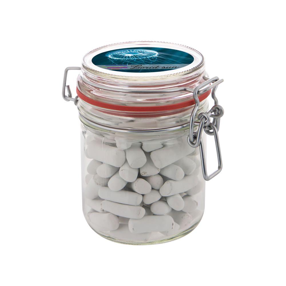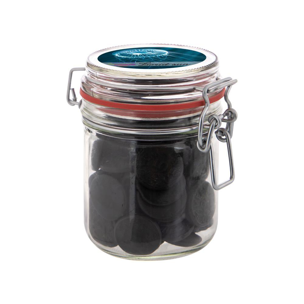 Enhance your marketing efforts with this reusable 0.4 liter Weck jar, filled with approximately 140 grams of metallic sweets. Customize it with a full-color sticker on the lid to showcase your logo, making it an ideal giveaway for events, trade shows, or client appreciation.