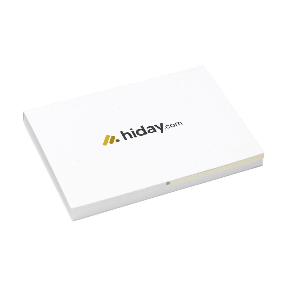 Elevate your brand visibility with this sustainable memo pad, featuring a soft recycled paper cover (300 g/m²). It includes 75 self-adhesive memo sheets in two practical sizes and 75 writable marking stickers, all crafted from recycled paper (70 g/m²). Proudly made in Europe for superior quality.