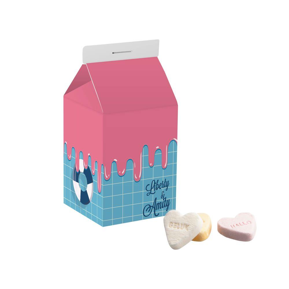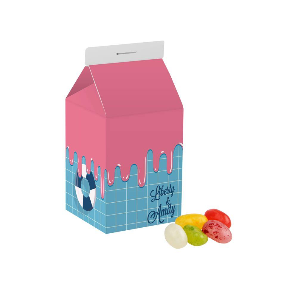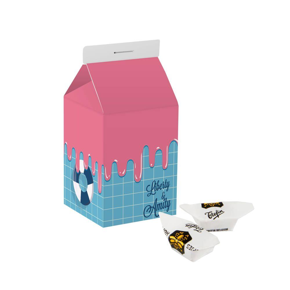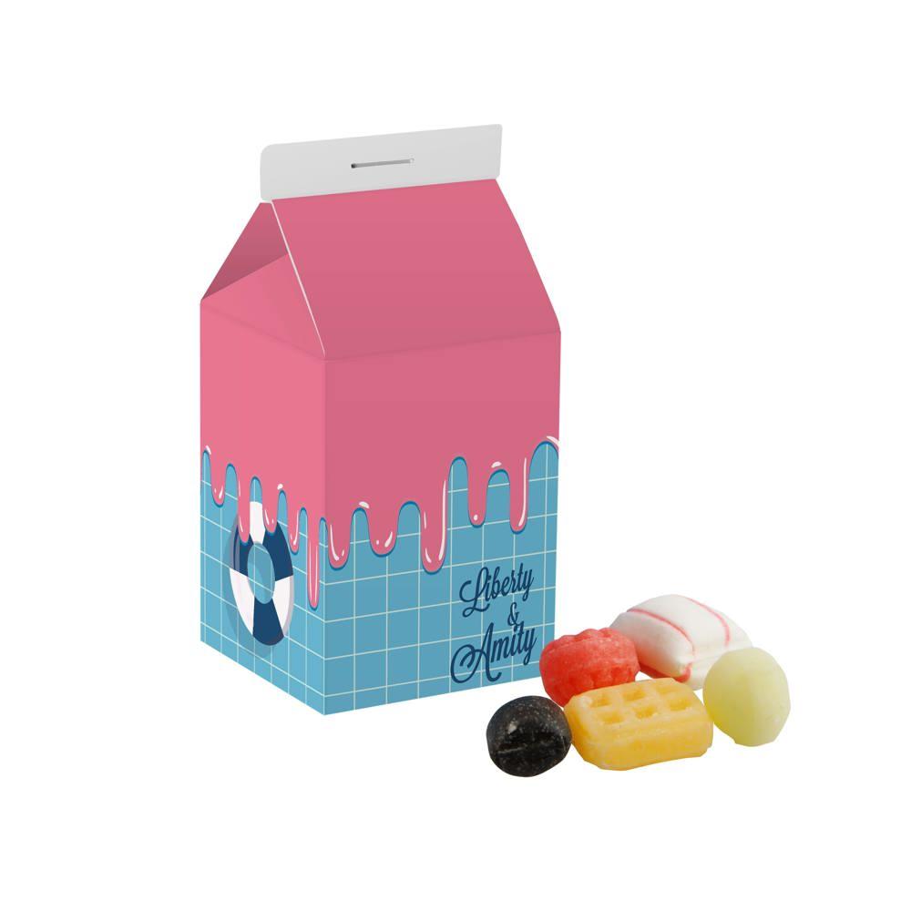 Elevate your promotional giveaways with this eye-catching personalized milk carton, featuring an all-over full-color print customized with your logo or branding. Filled with approximately 170 grams of assorted licorice sticks, it delivers a delightful mix of flavors in a compact, nostalgic package perfect for events, trade shows, or client appreciation.